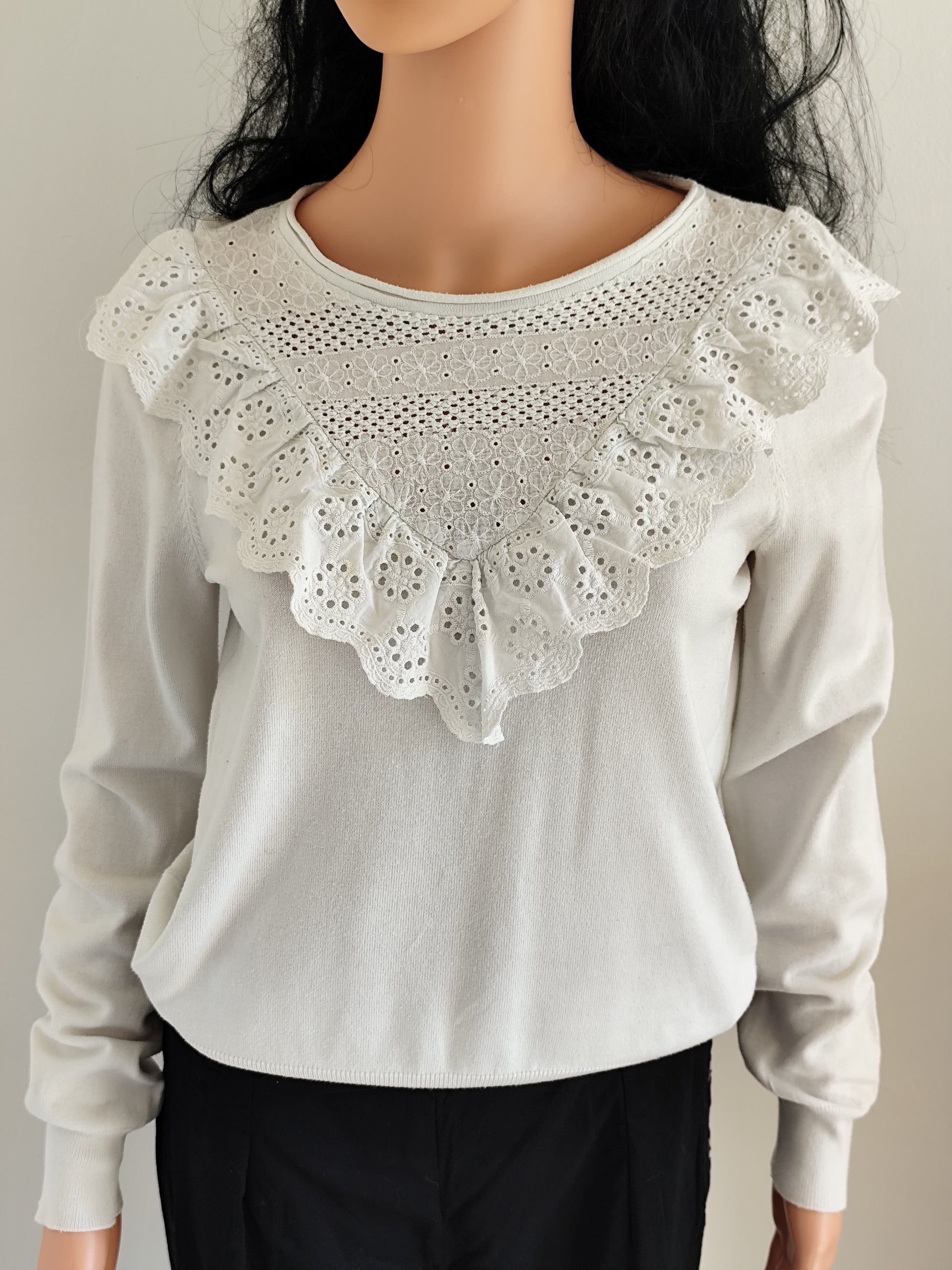 #nafnaf #pullblanc #broderieanglaise #pullfemme #taille36 #taille38 #romantique #lookchic #secondevie #modedouce #slowfashion