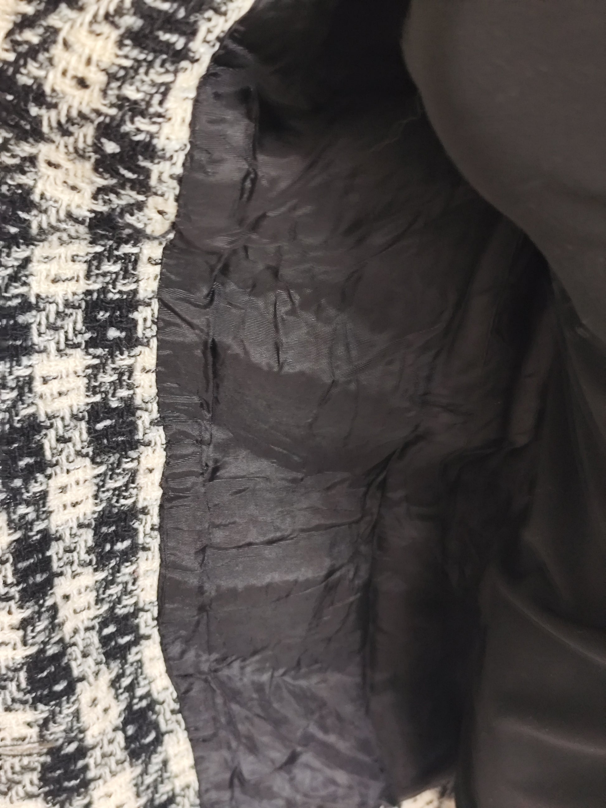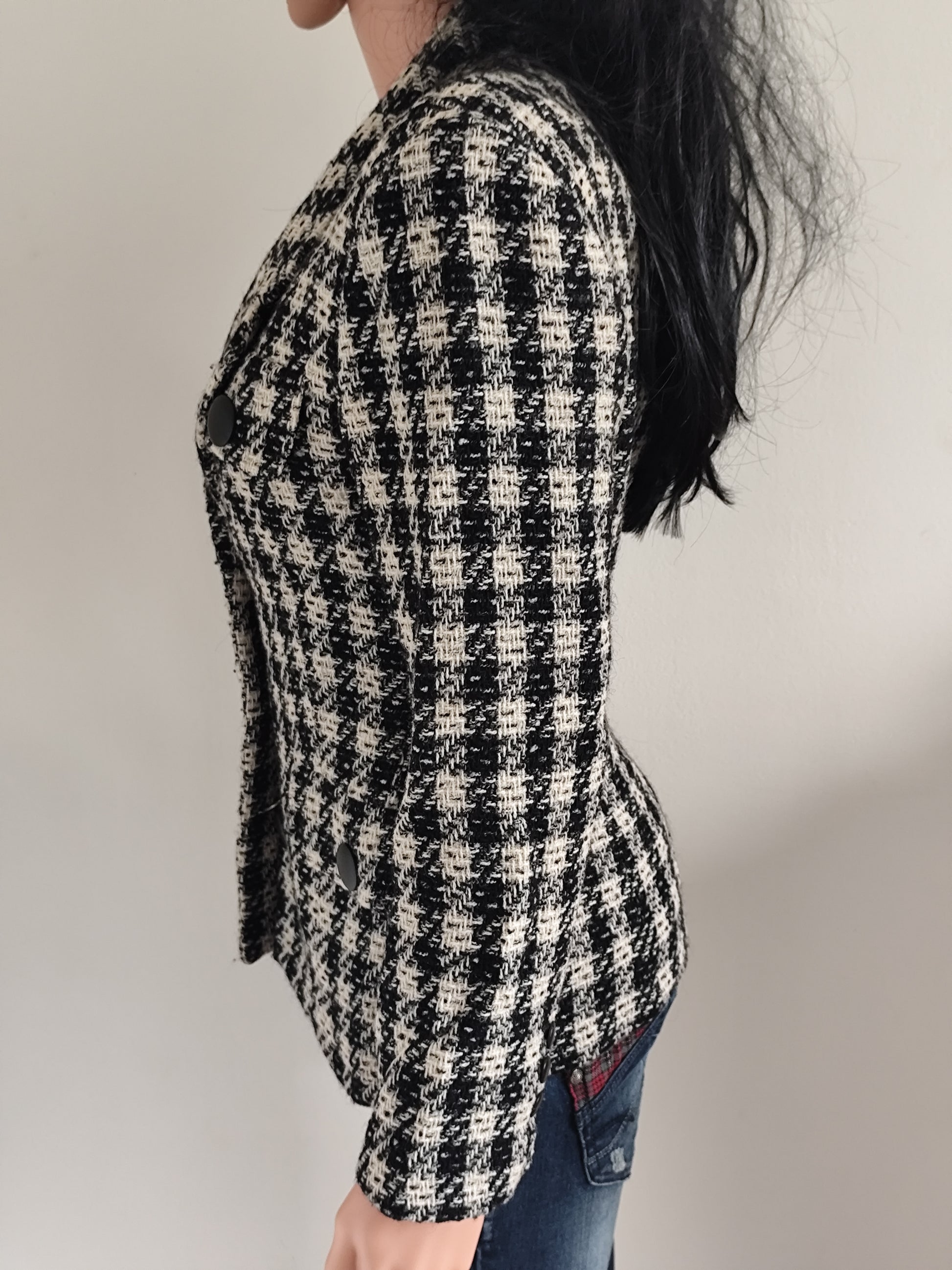 Superbe blazer à motif pied-de-poule noir et blanc signée Vertigo Paris, marque réputée pour ses coupes féminines et ses finitions soignées.
