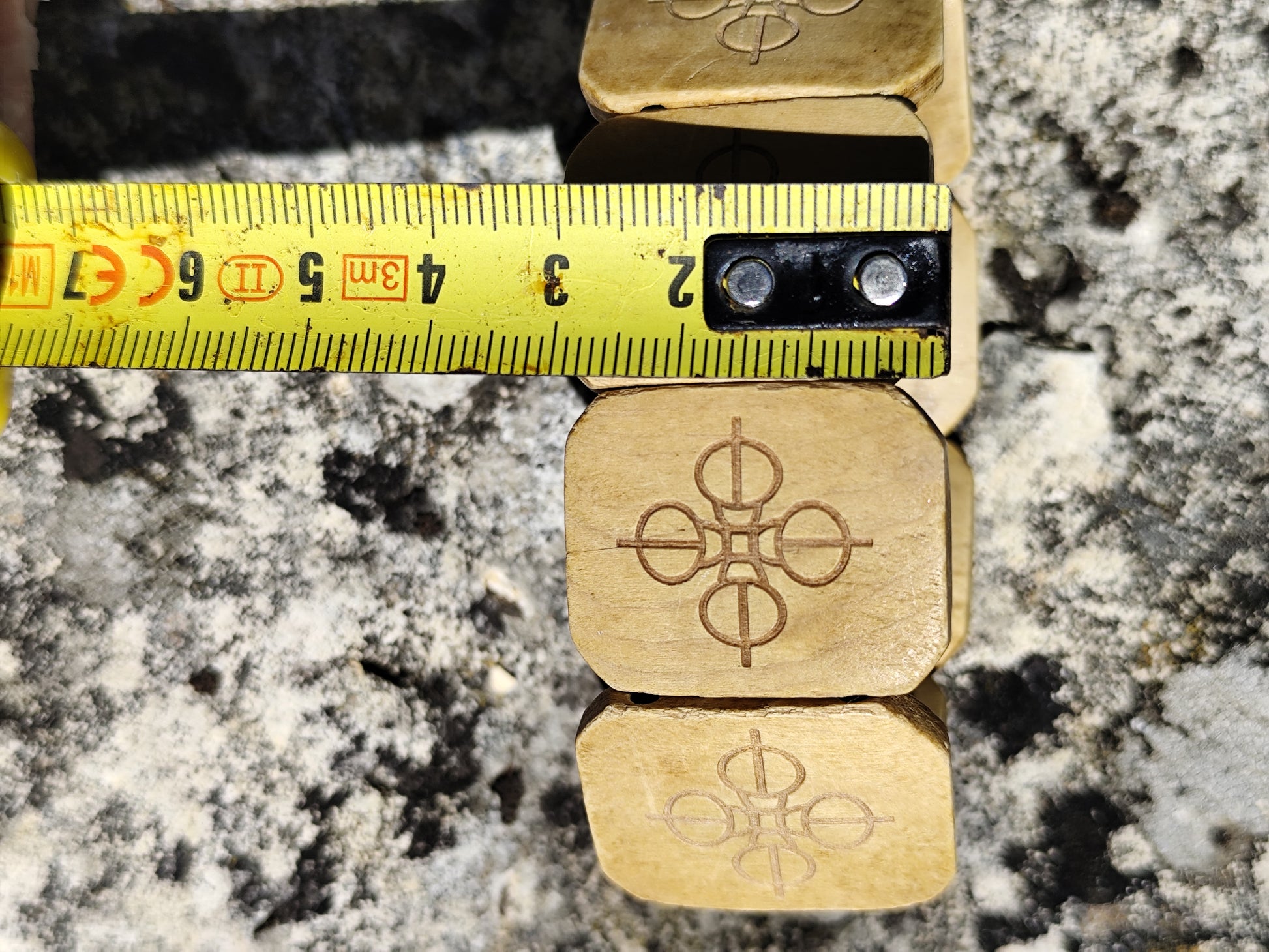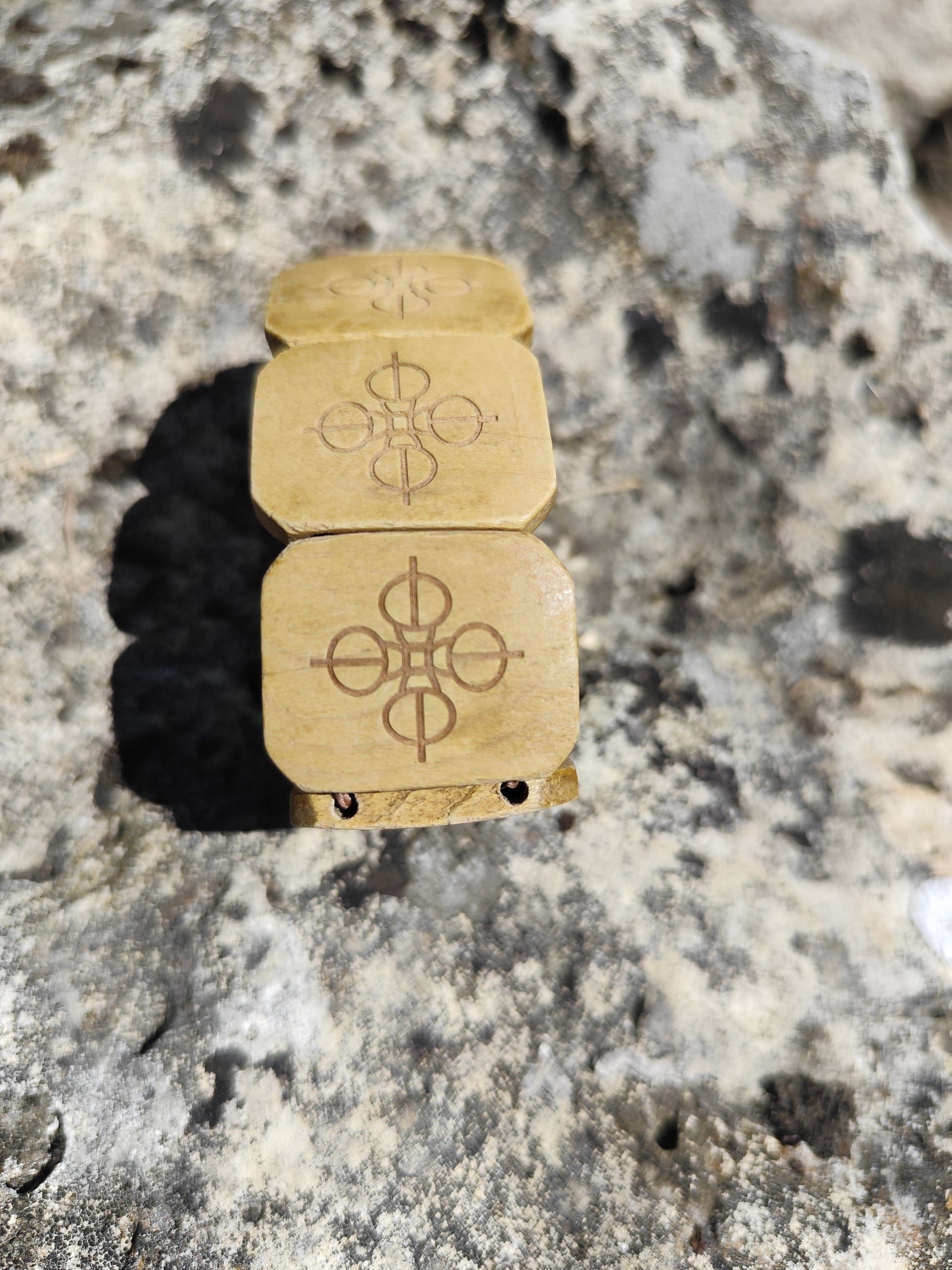 Ce bracelet  est composé de pièces en bois clair, gravées de motifs géométriques.