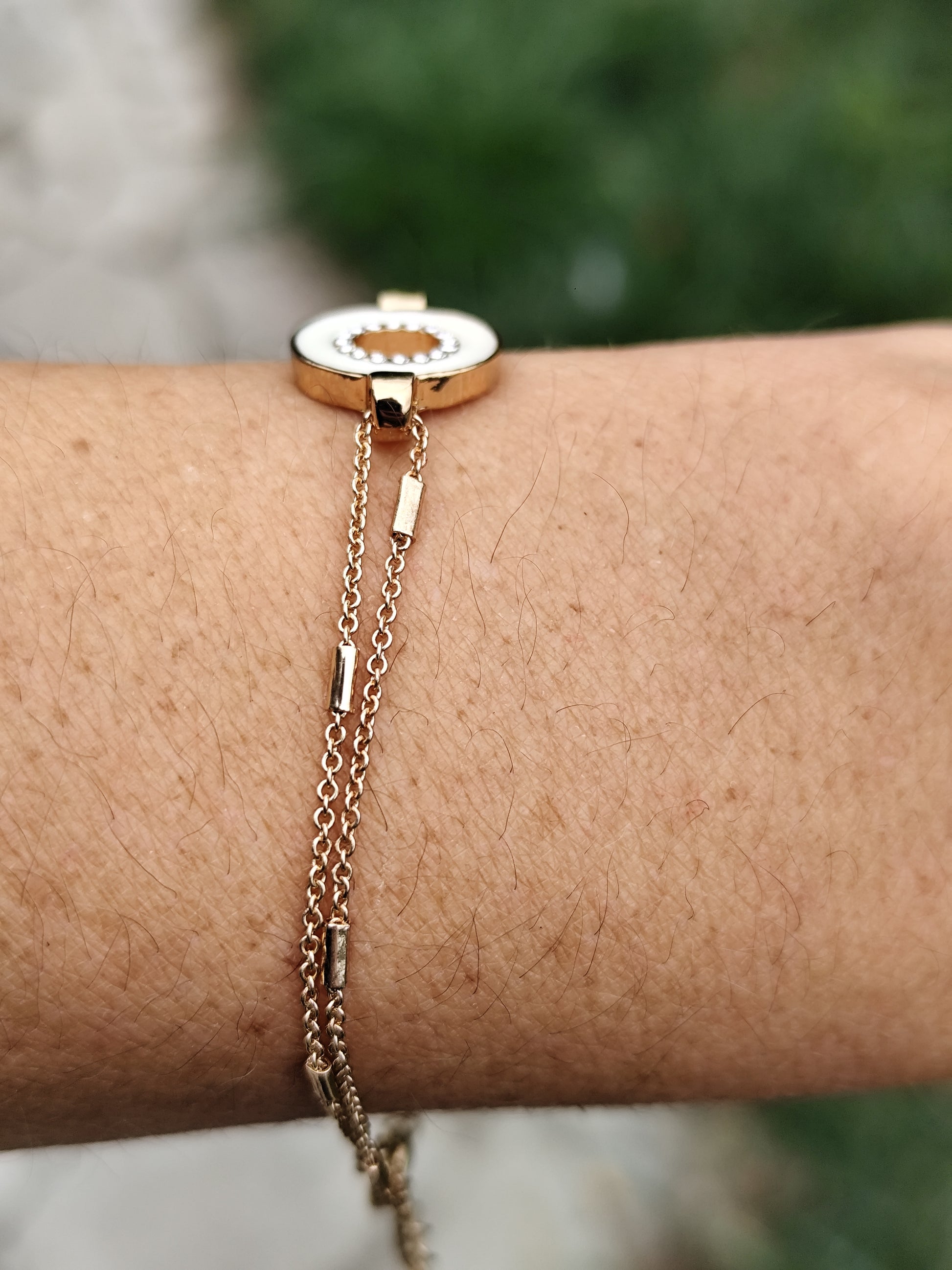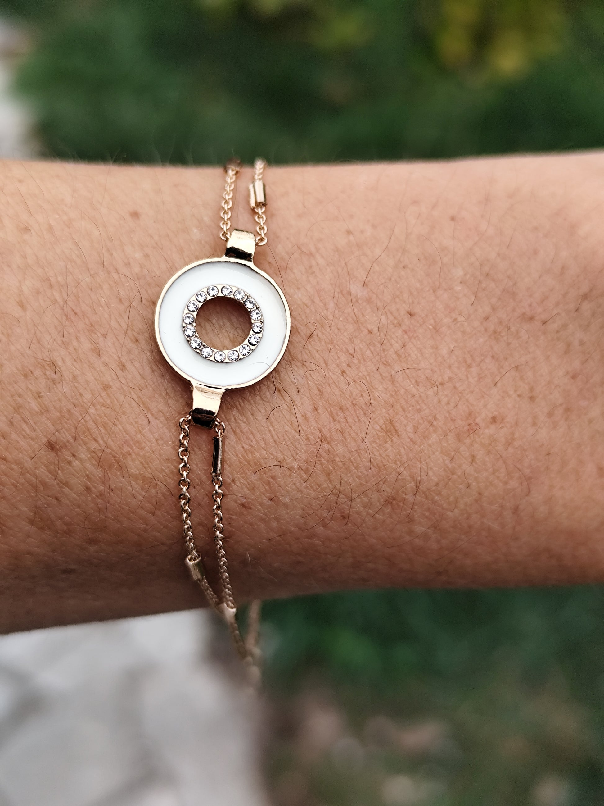 Bracelet fantaisie raffiné en métal doré, orné d’un cercle central en nacre blanche.