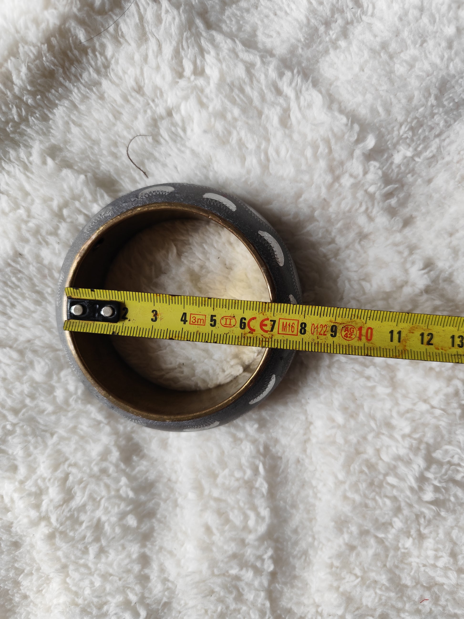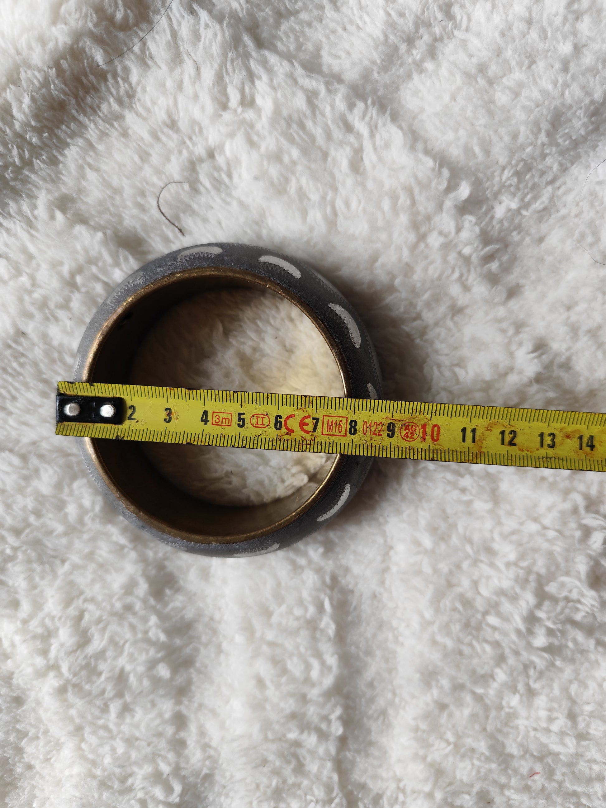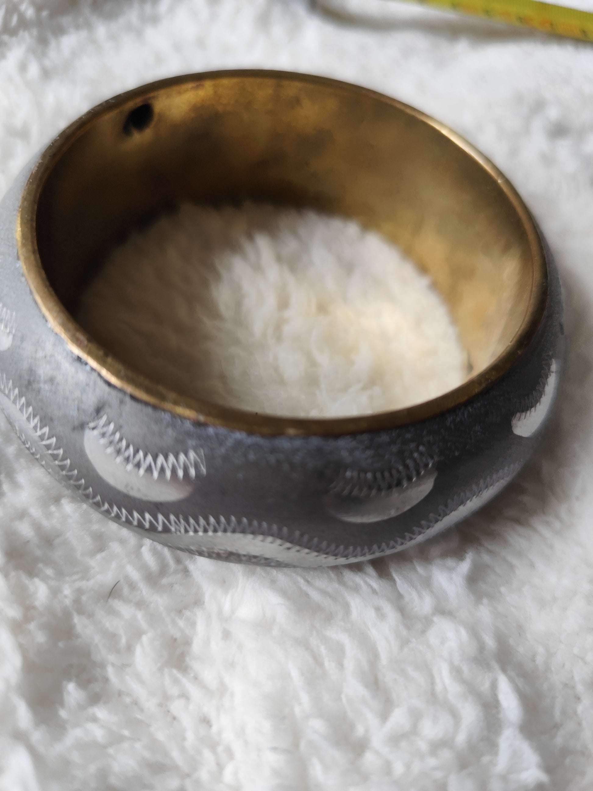 Manchette rigide en métal argenté, décorée de motifs gravés. Largeur 3 cm environ, diamètre intérieur 6,5 cm. Pièce élégante et originale, parfaite pour apporter une touche chic et ethnique à vos tenues.