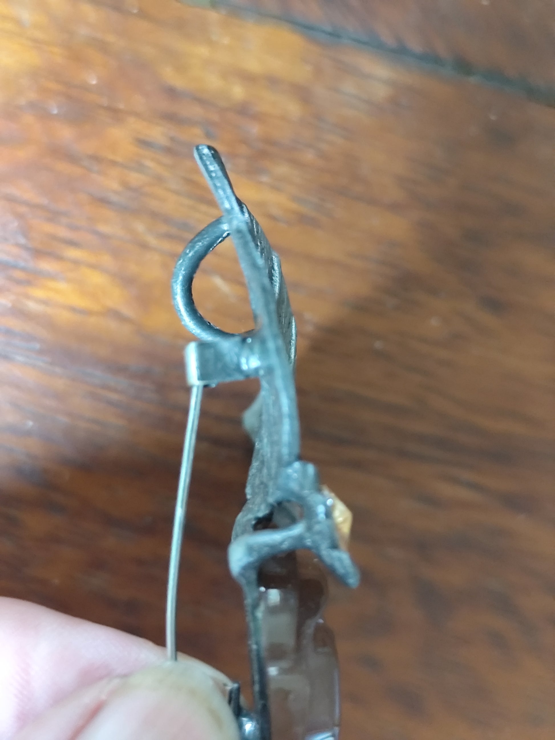 Particularité : en plus du fermoir à épingle classique, elle possède une seconde accroche au dos, permettant de la porter également en pendentif sur une chaîne ou un ruban.