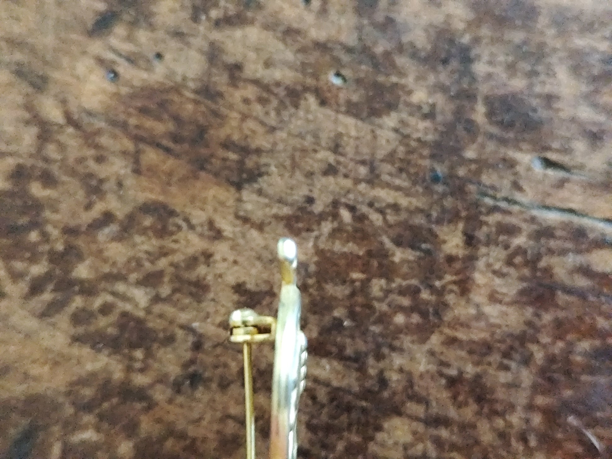 Charmante broche rétro en forme de cor de chasse / instrument de musique, finition dorée et détails strassés.