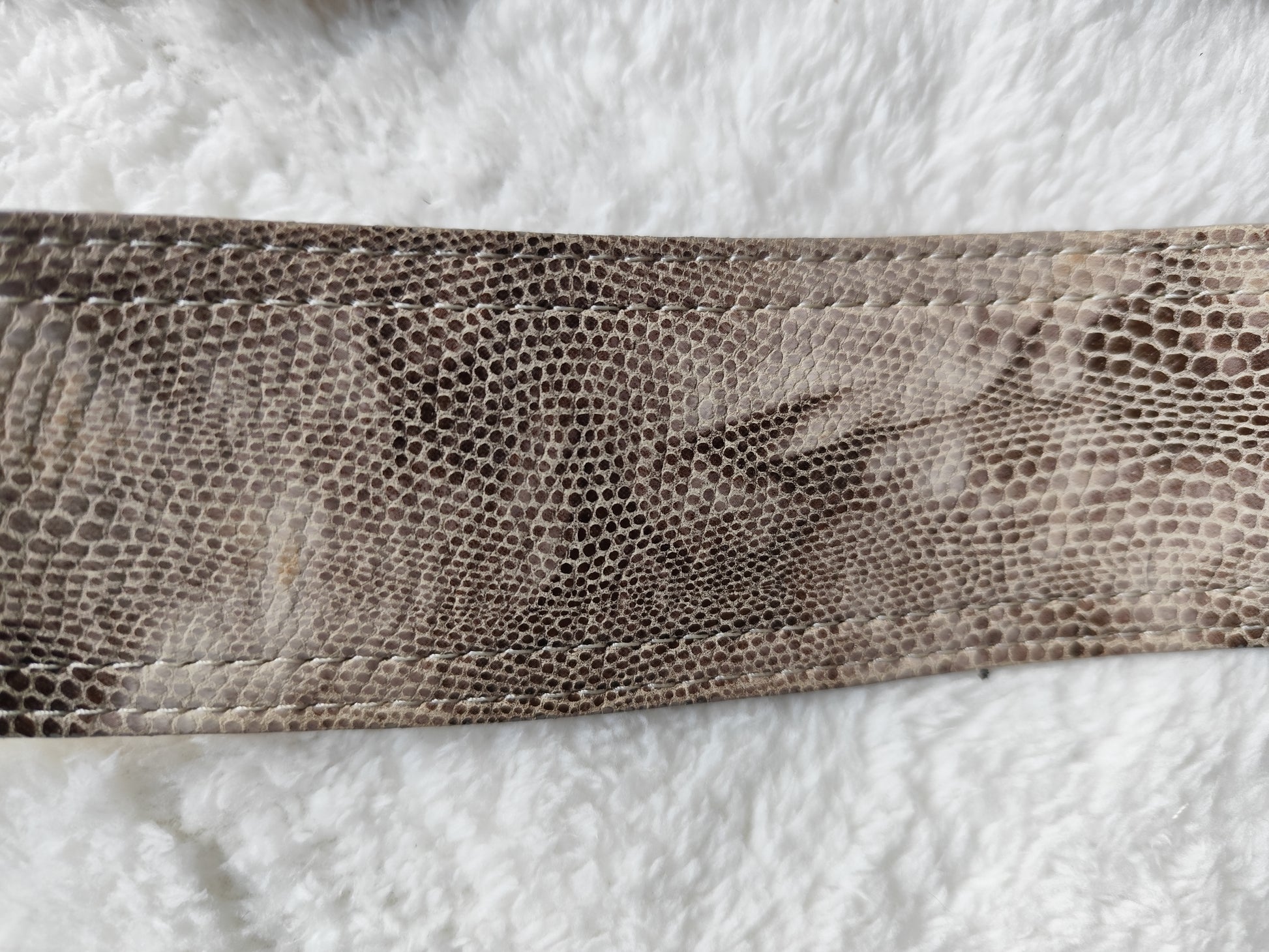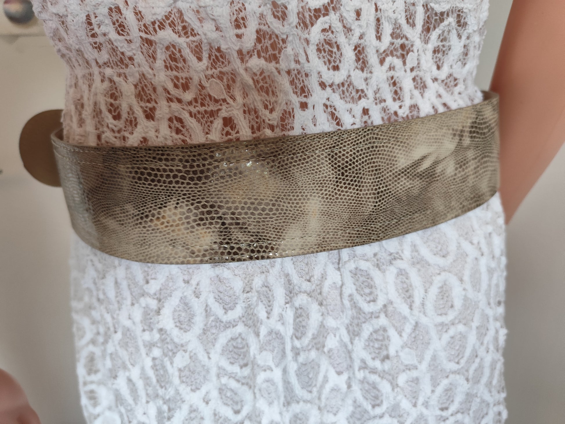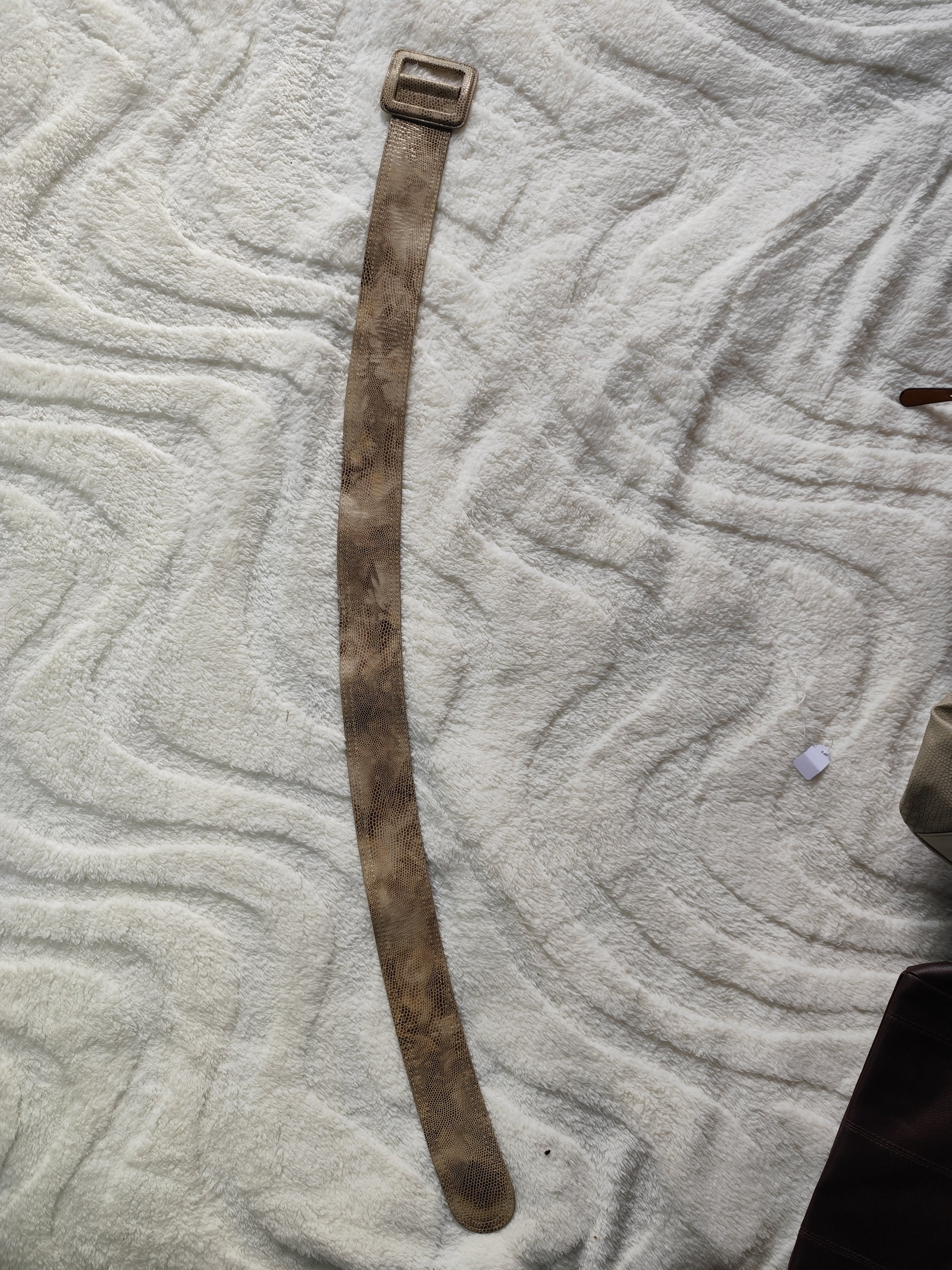 Coloris doré vieilli avec effet python embossé, boucle recouverte assortie.