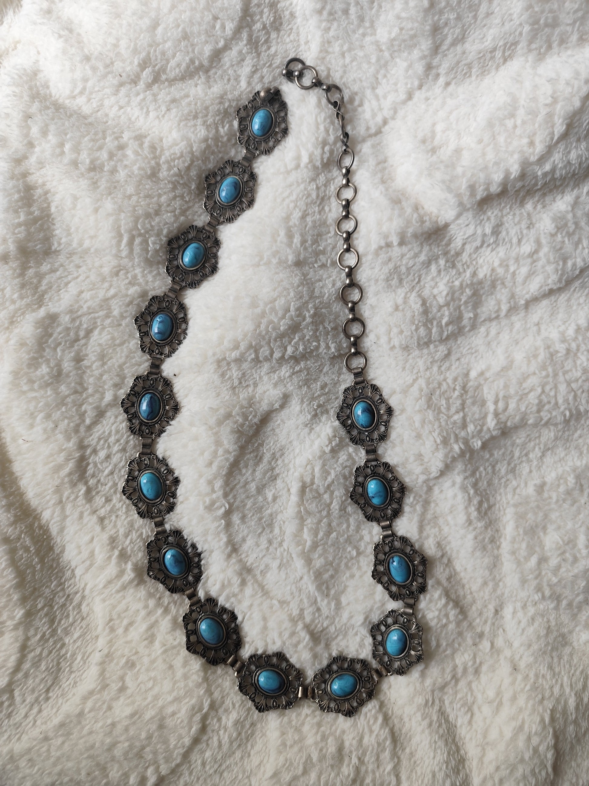 Ceinture fantaisie métal argenté et cabochons bleus turquoise – 95 cm