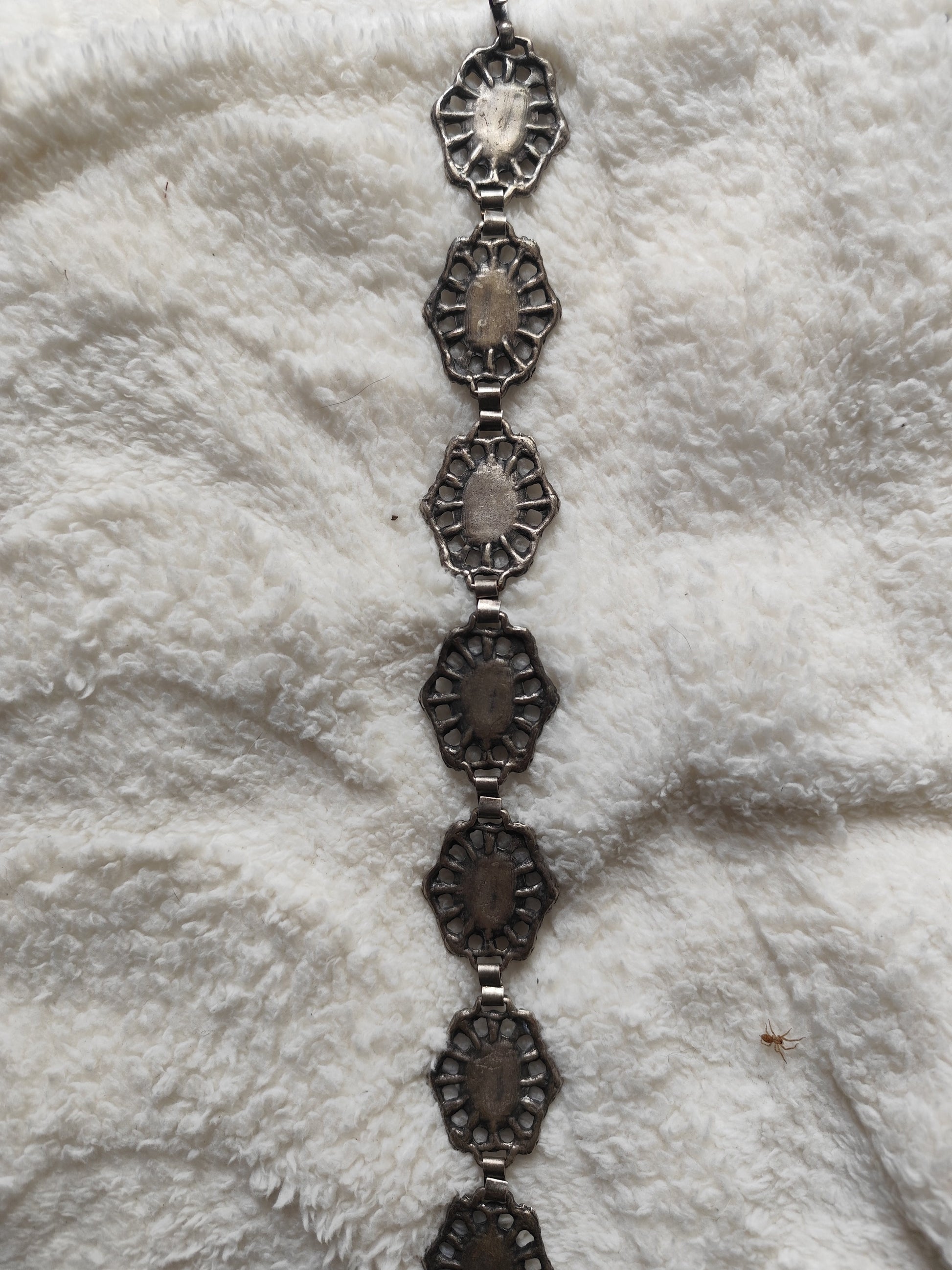 Ceinture décorative en métal argenté, ornée de cabochons bleus turquoise.