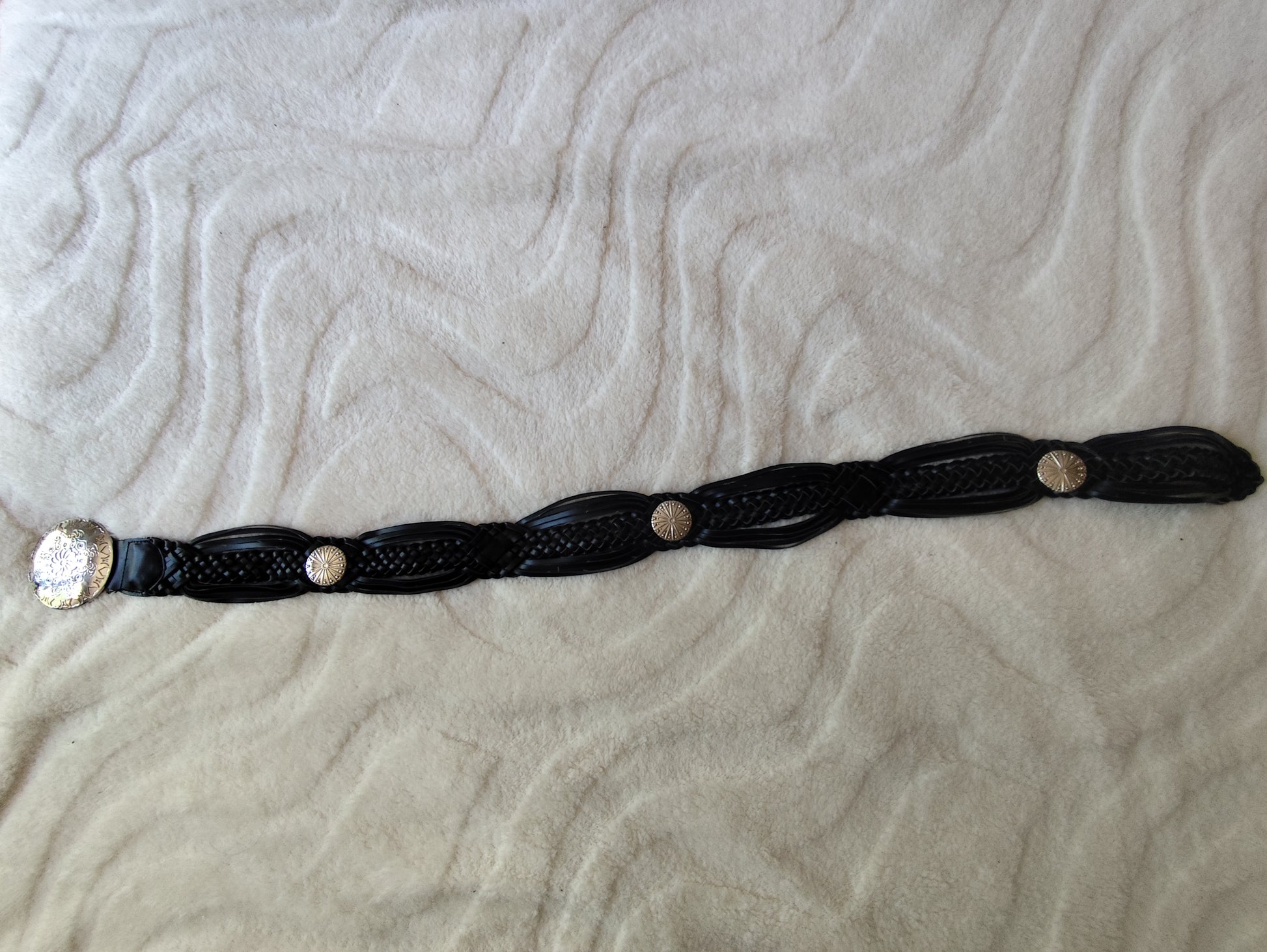 Ceinture vintage noire tressée avec méga boucle ronde gravée florale 💥