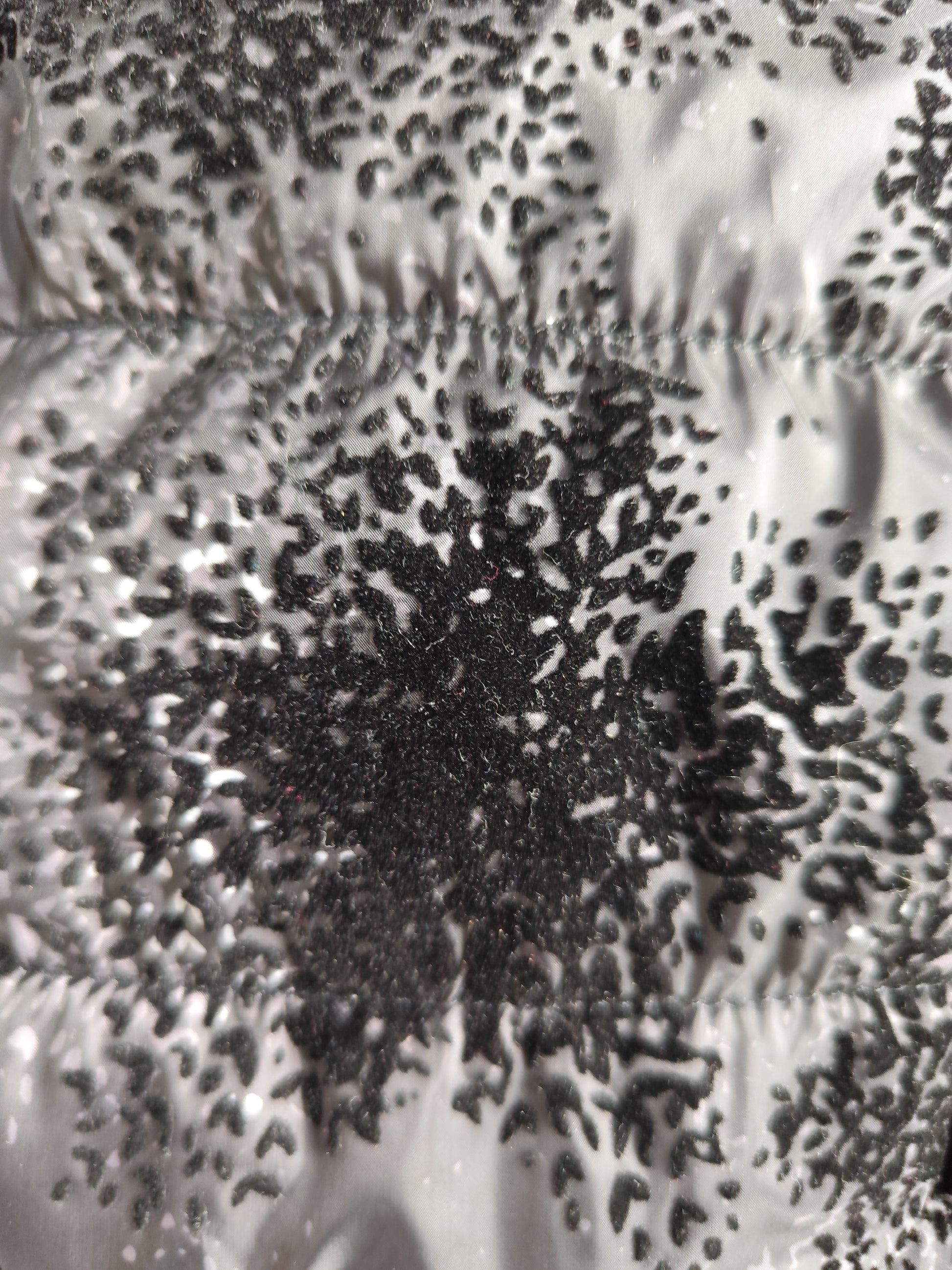 Jolie doudoune avec imprimé à effet velours sur les parties noires du motif.