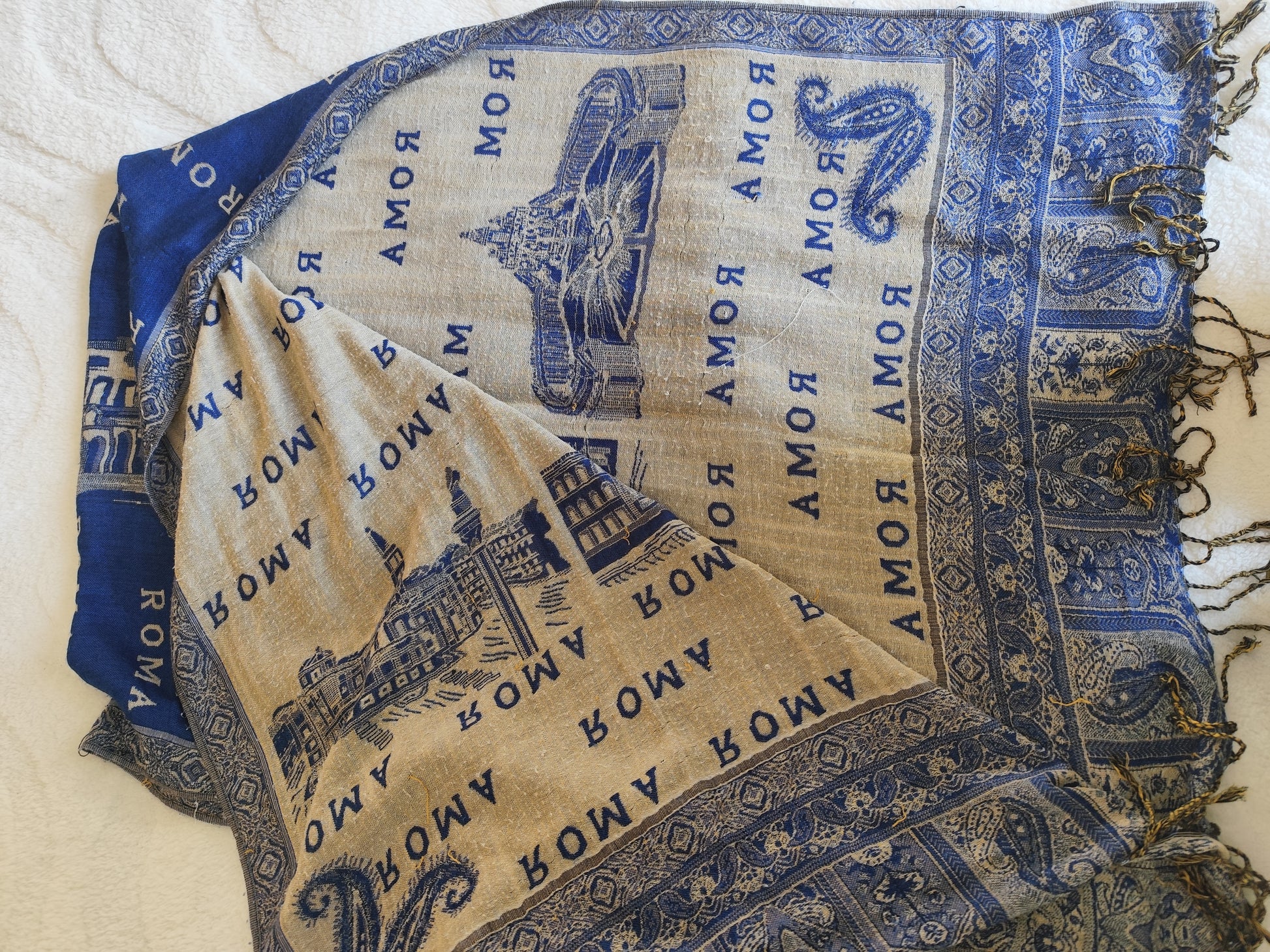 Grande écharpe vintage bleu imprimé Roma – 192x69 cm