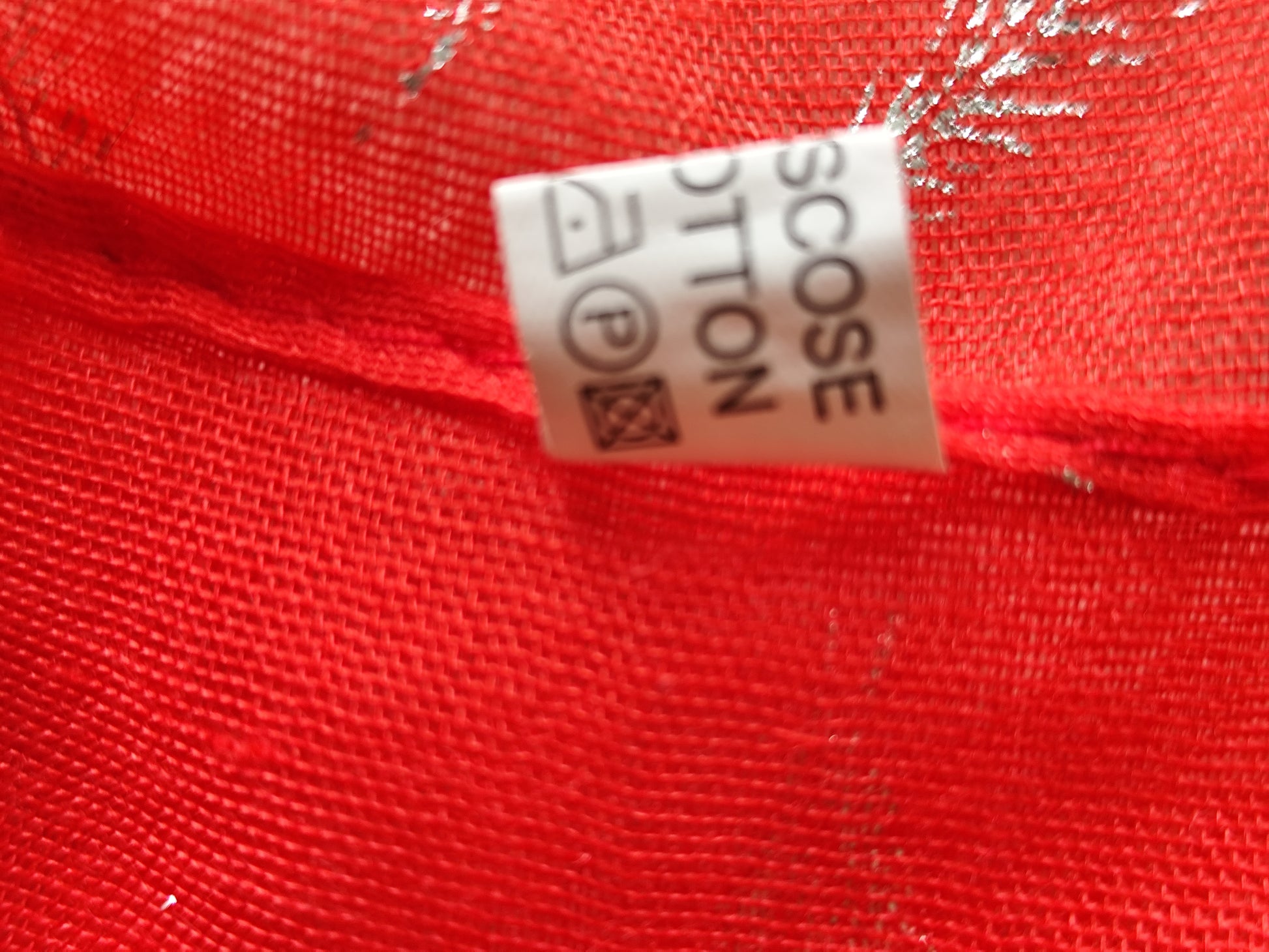 Foulard rouge à plumes argentées – viscose et coton – 192 x 69 cm