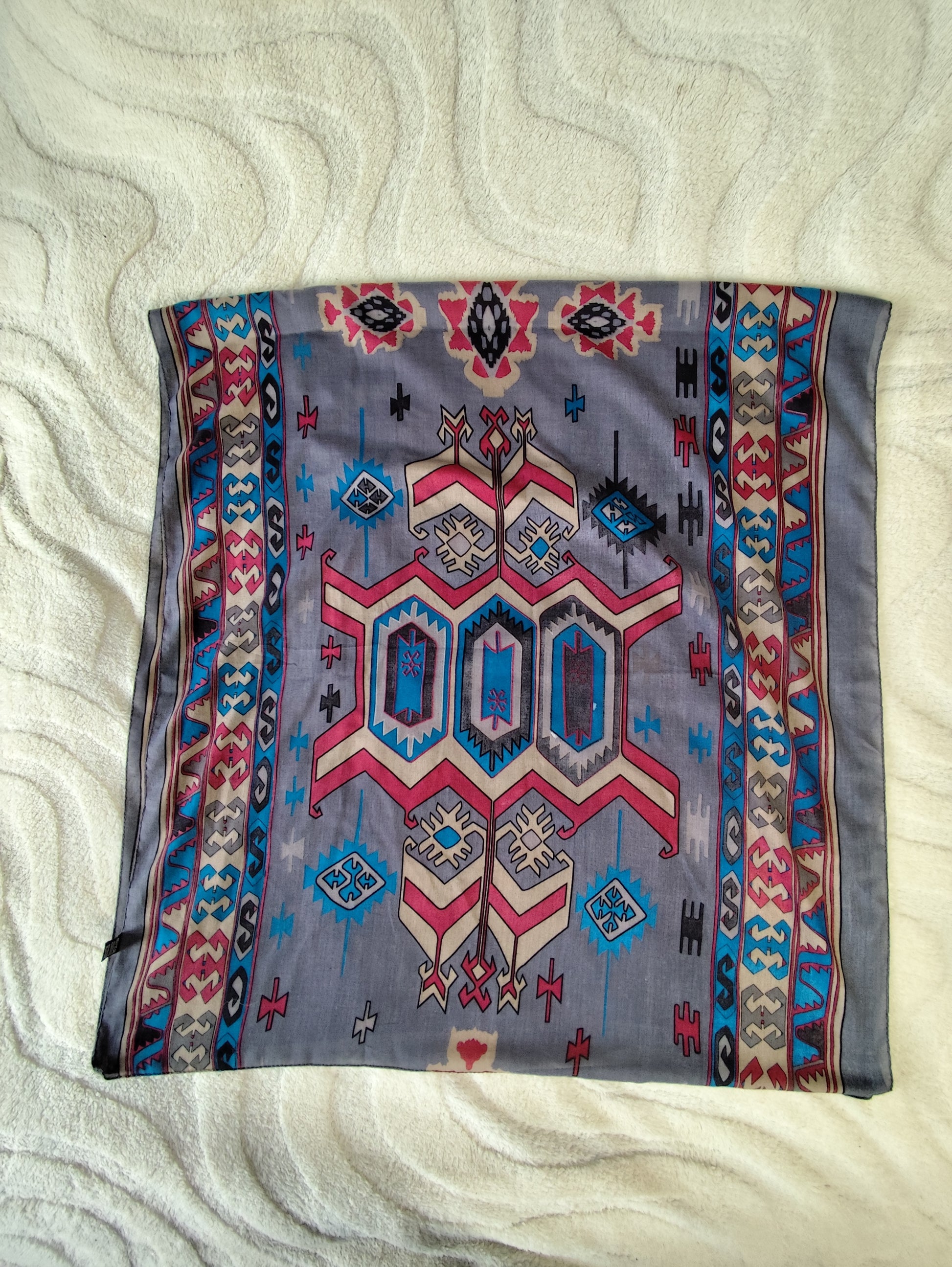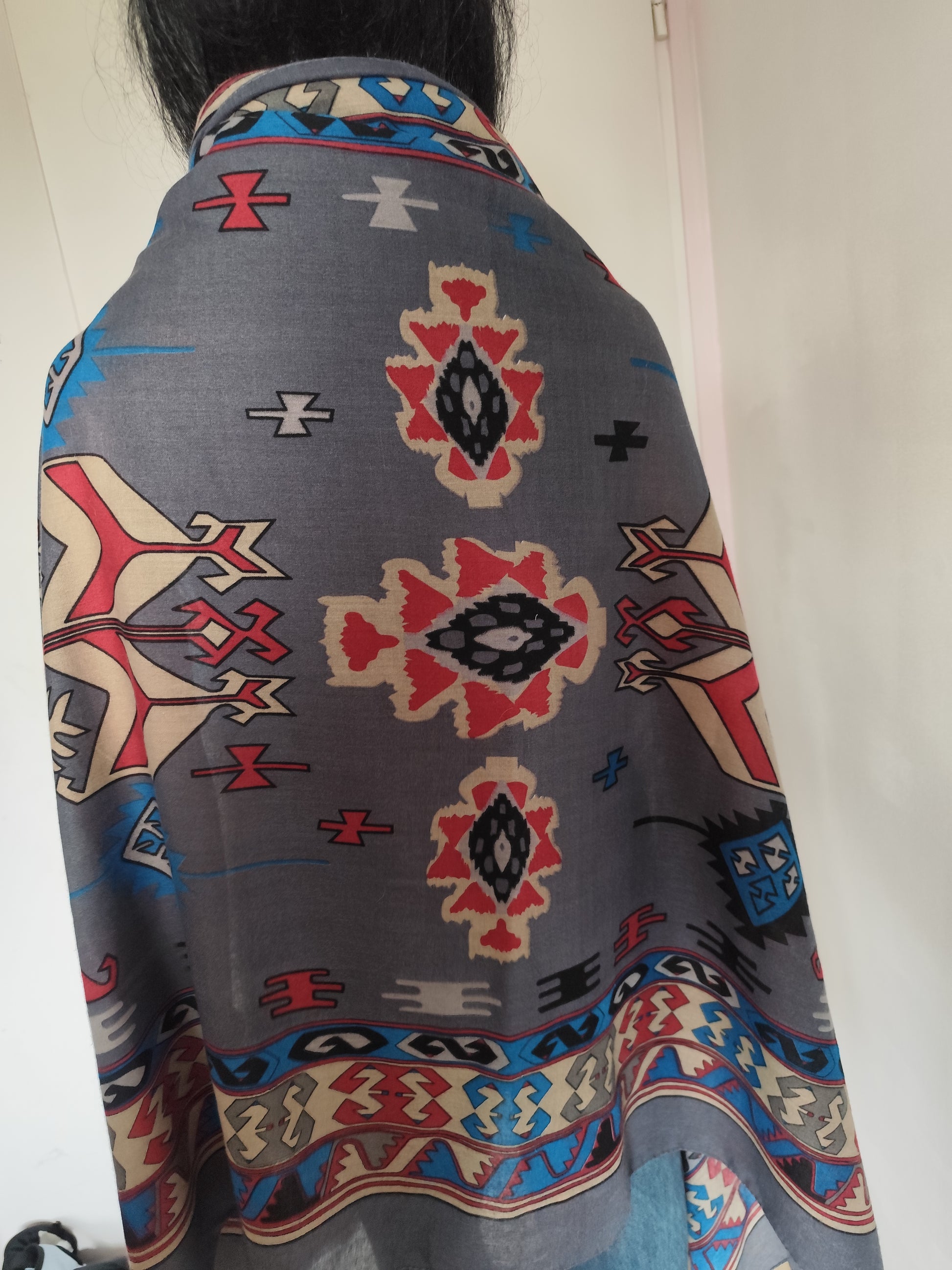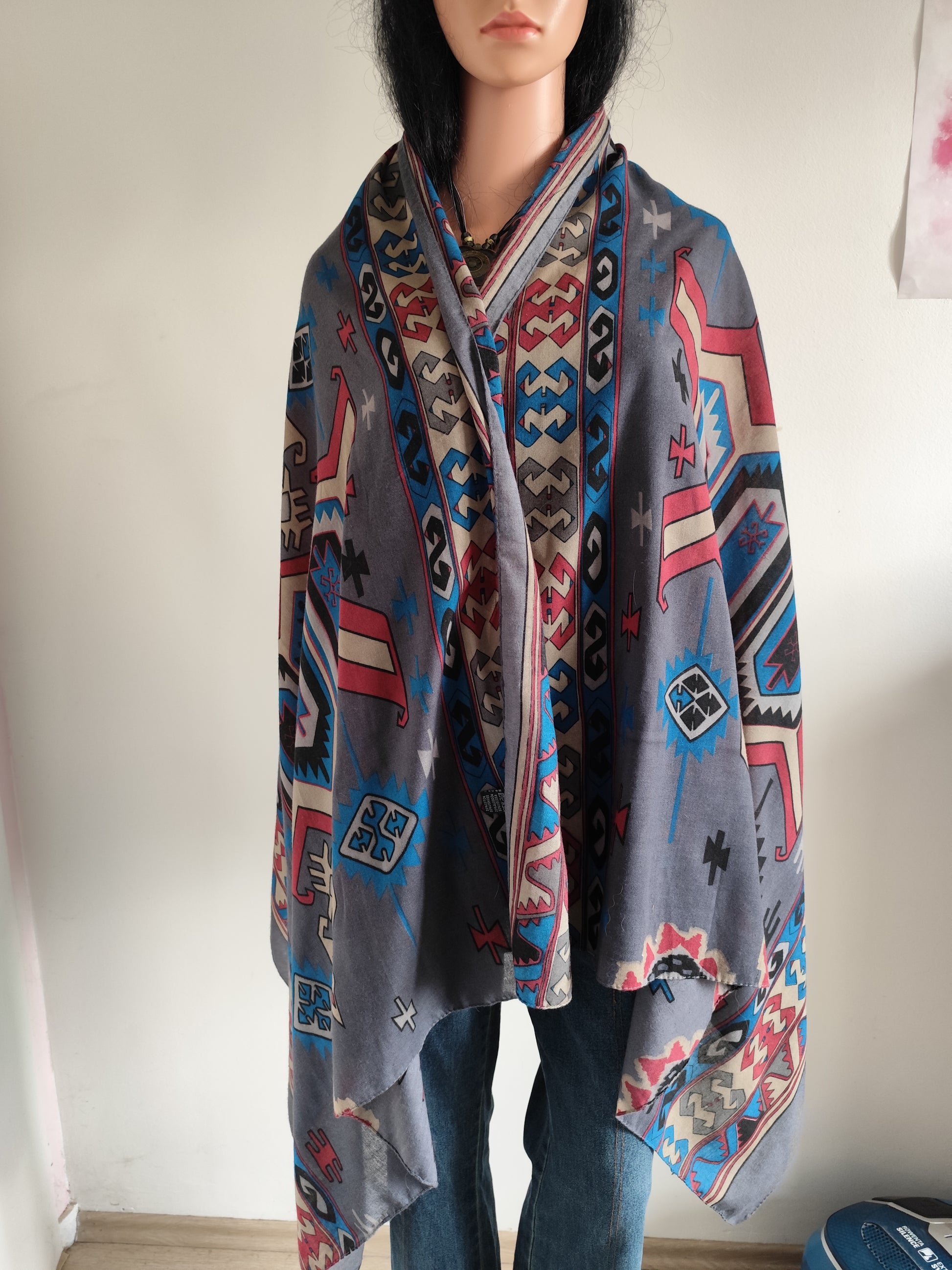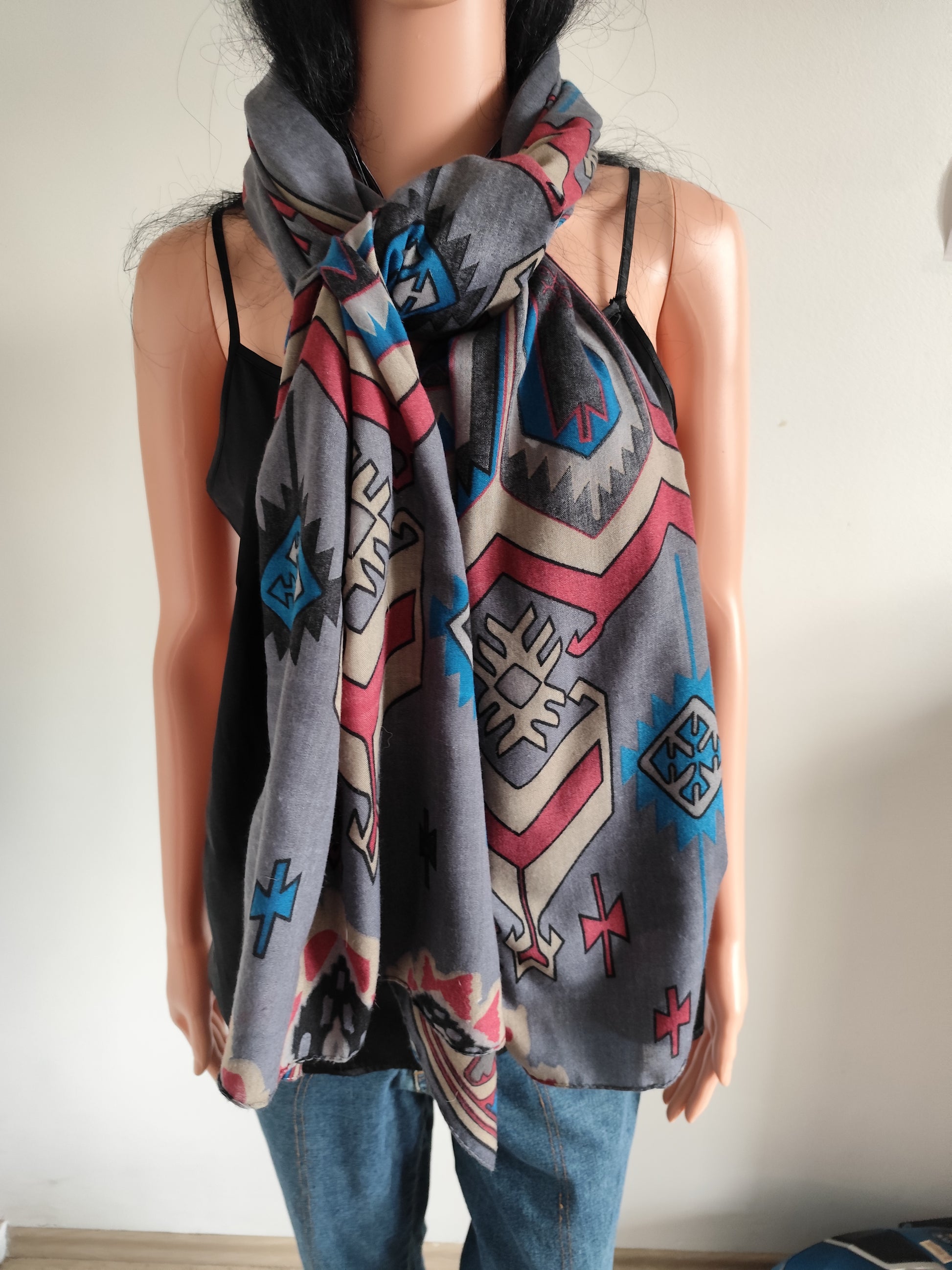 Grande étole fluide gris moyen à motifs ethniques rouges, bleus et beiges.