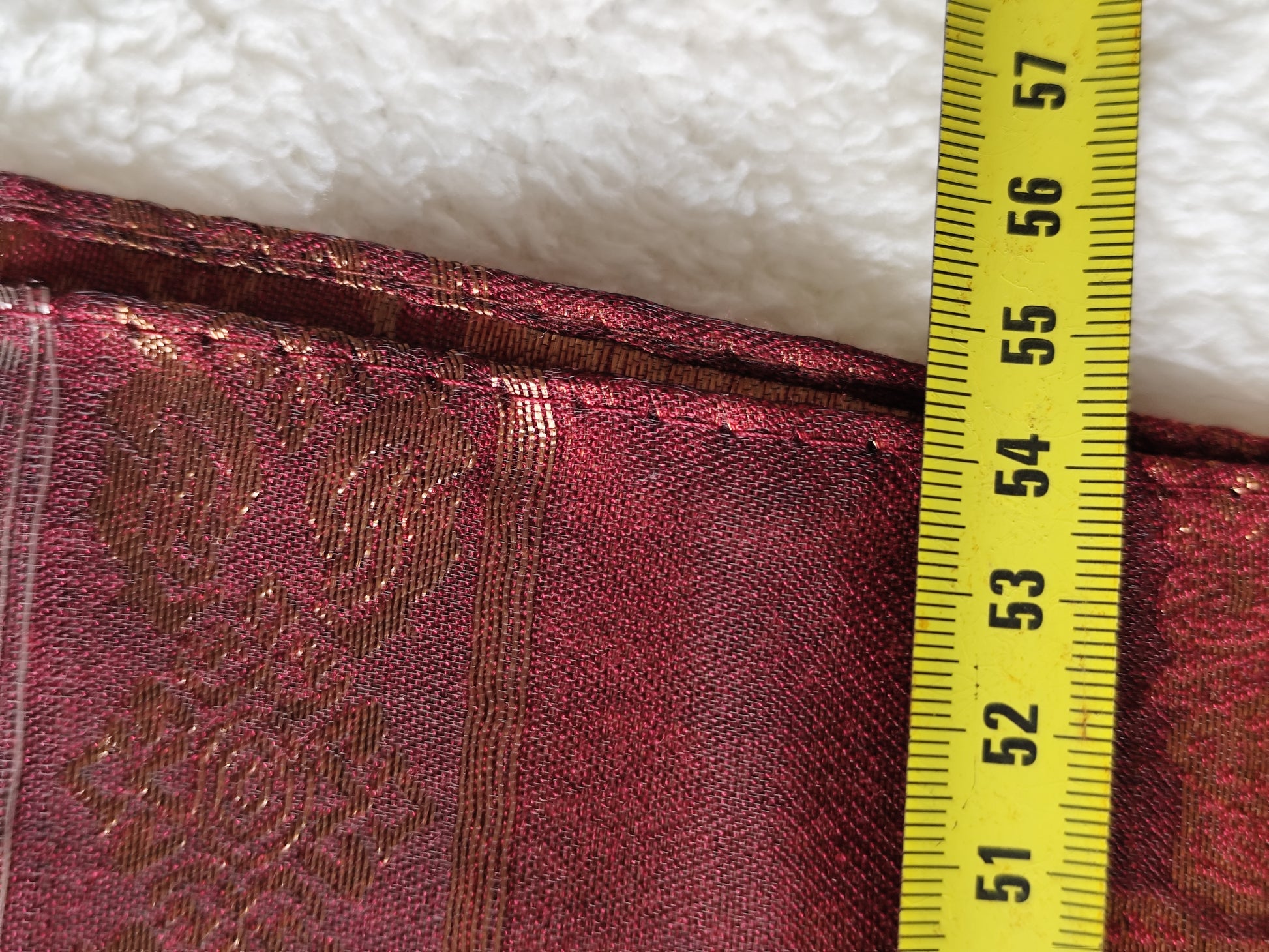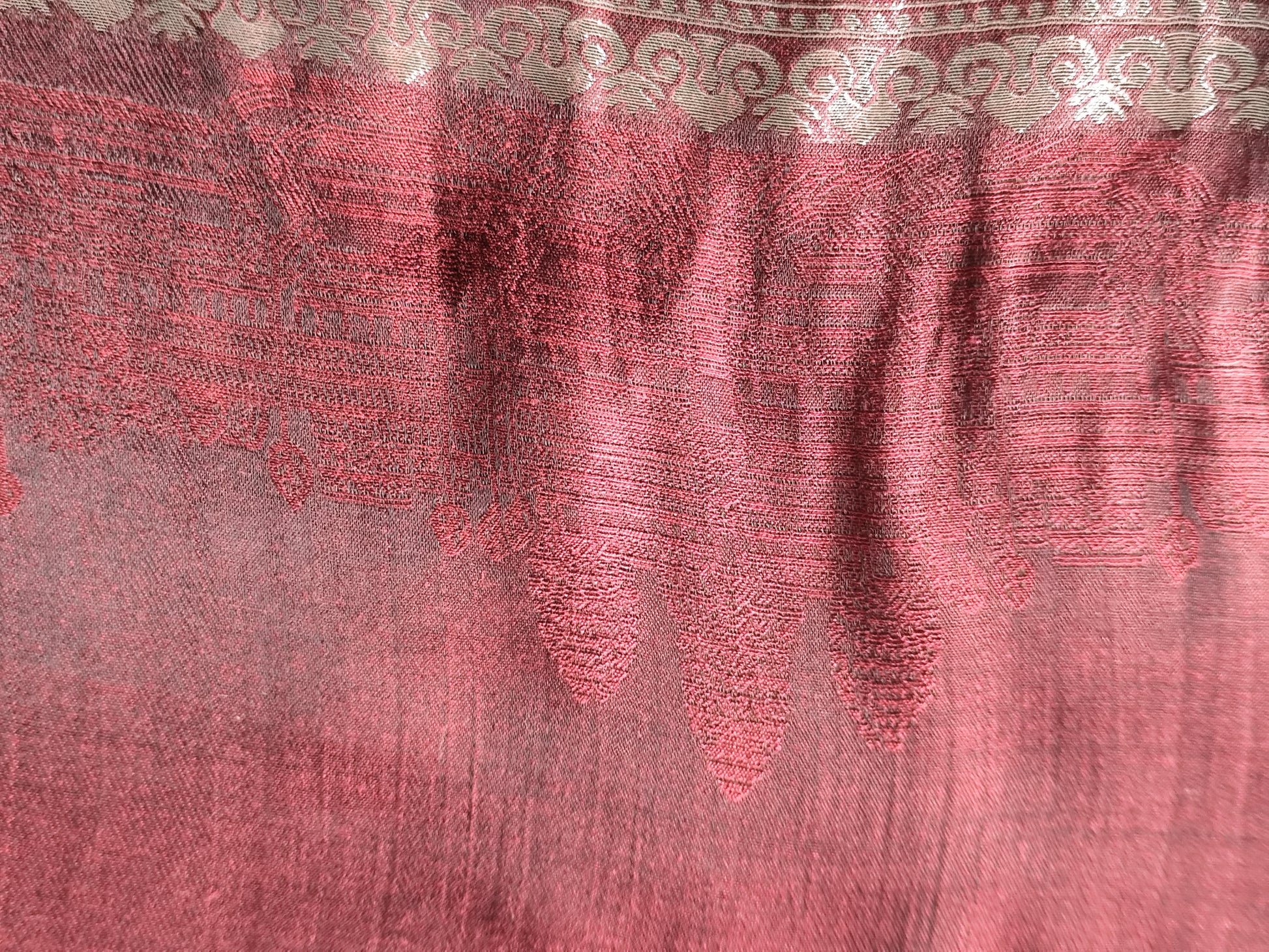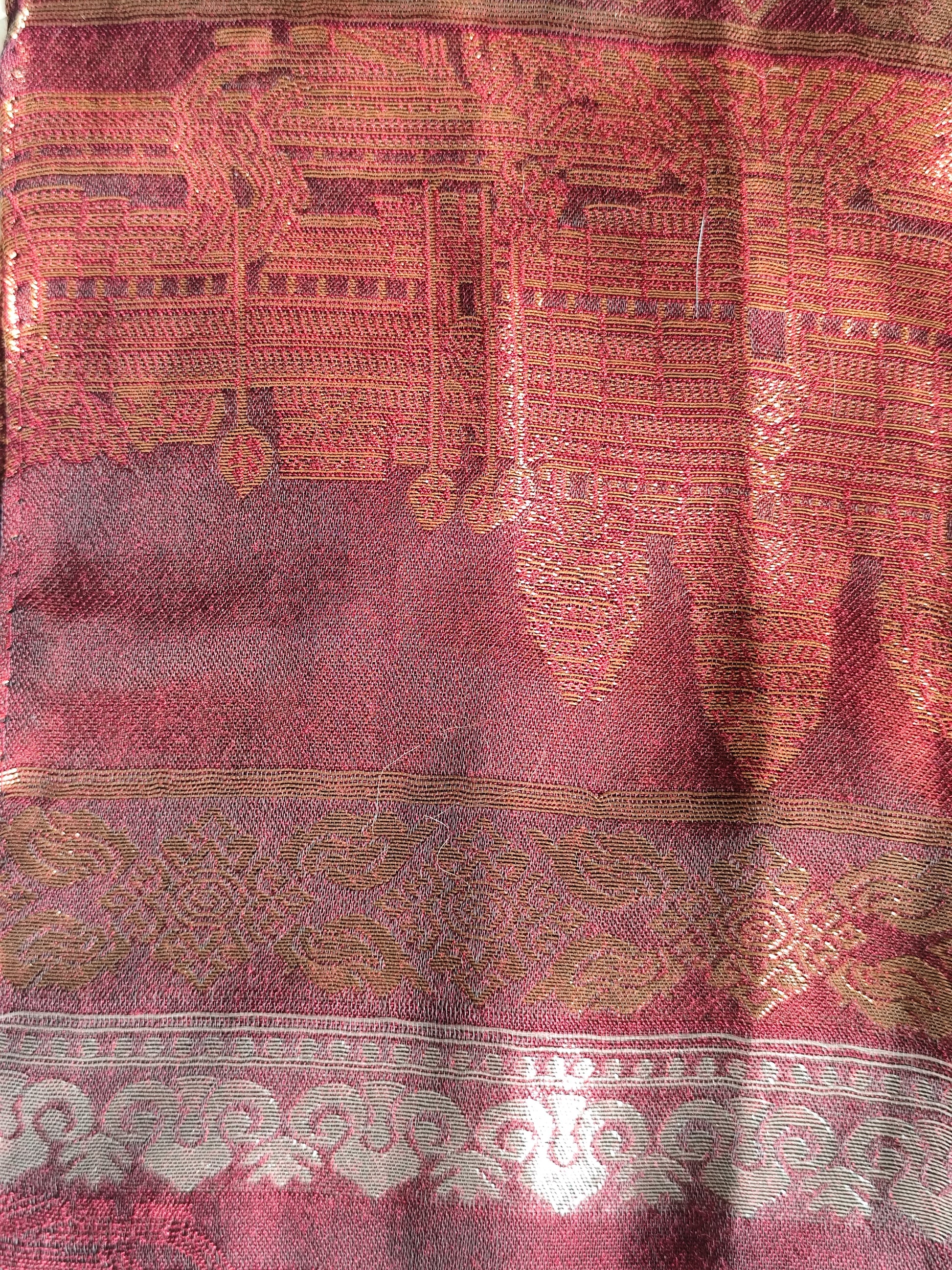 Couleurs chaudes : rouge profond mêlé de reflets dorés, motifs traditionnels subtils