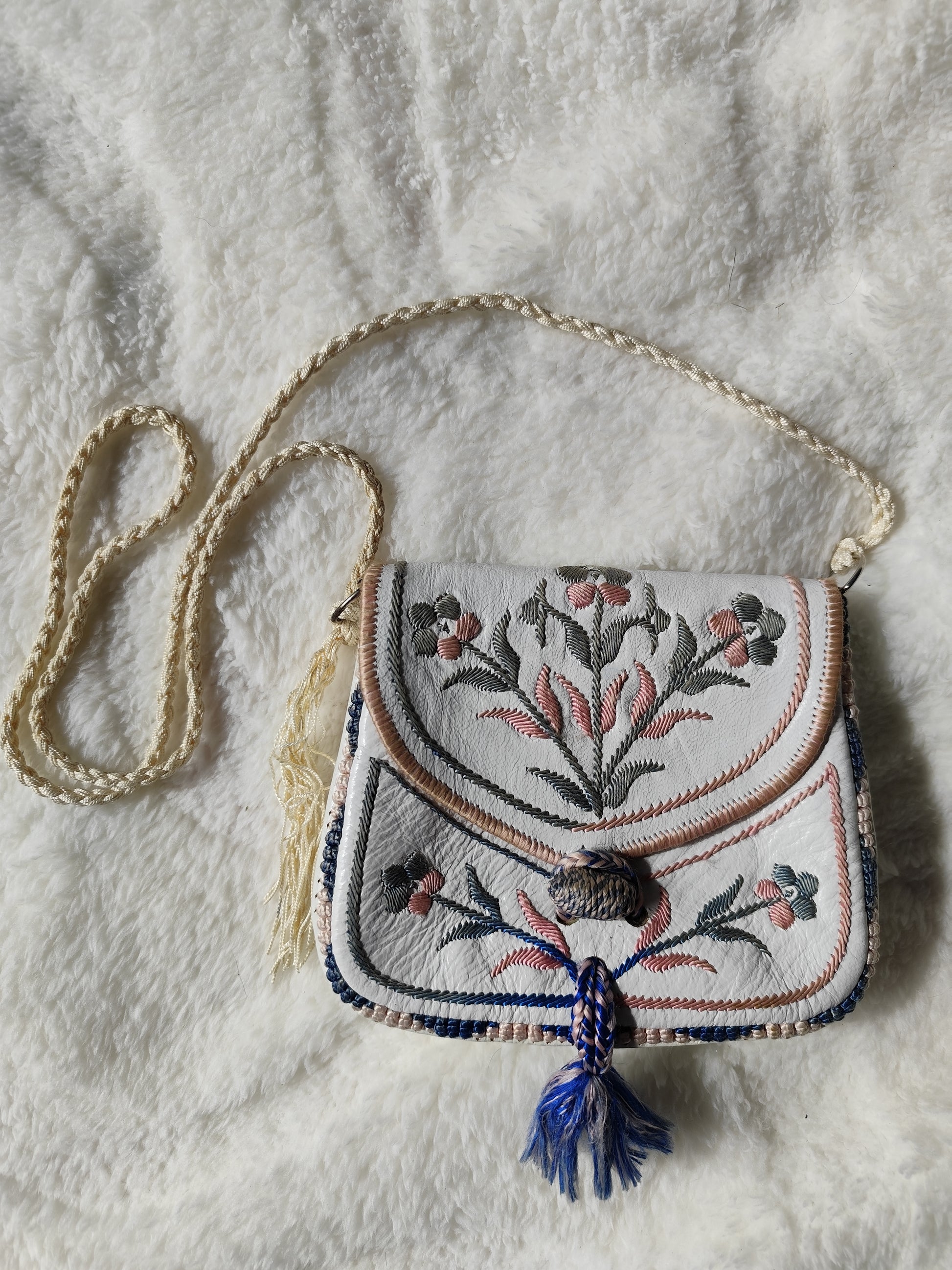 🎨 Coloris : blanc cassé, motifs brodés bleu & rose, intérieur camel