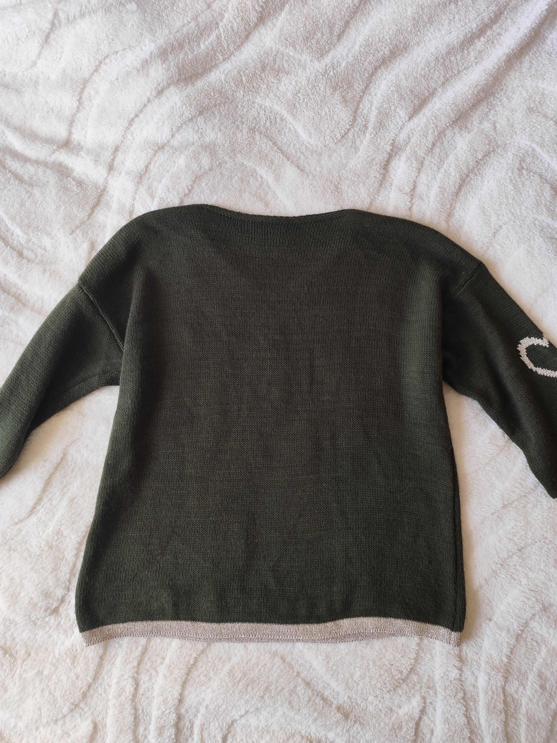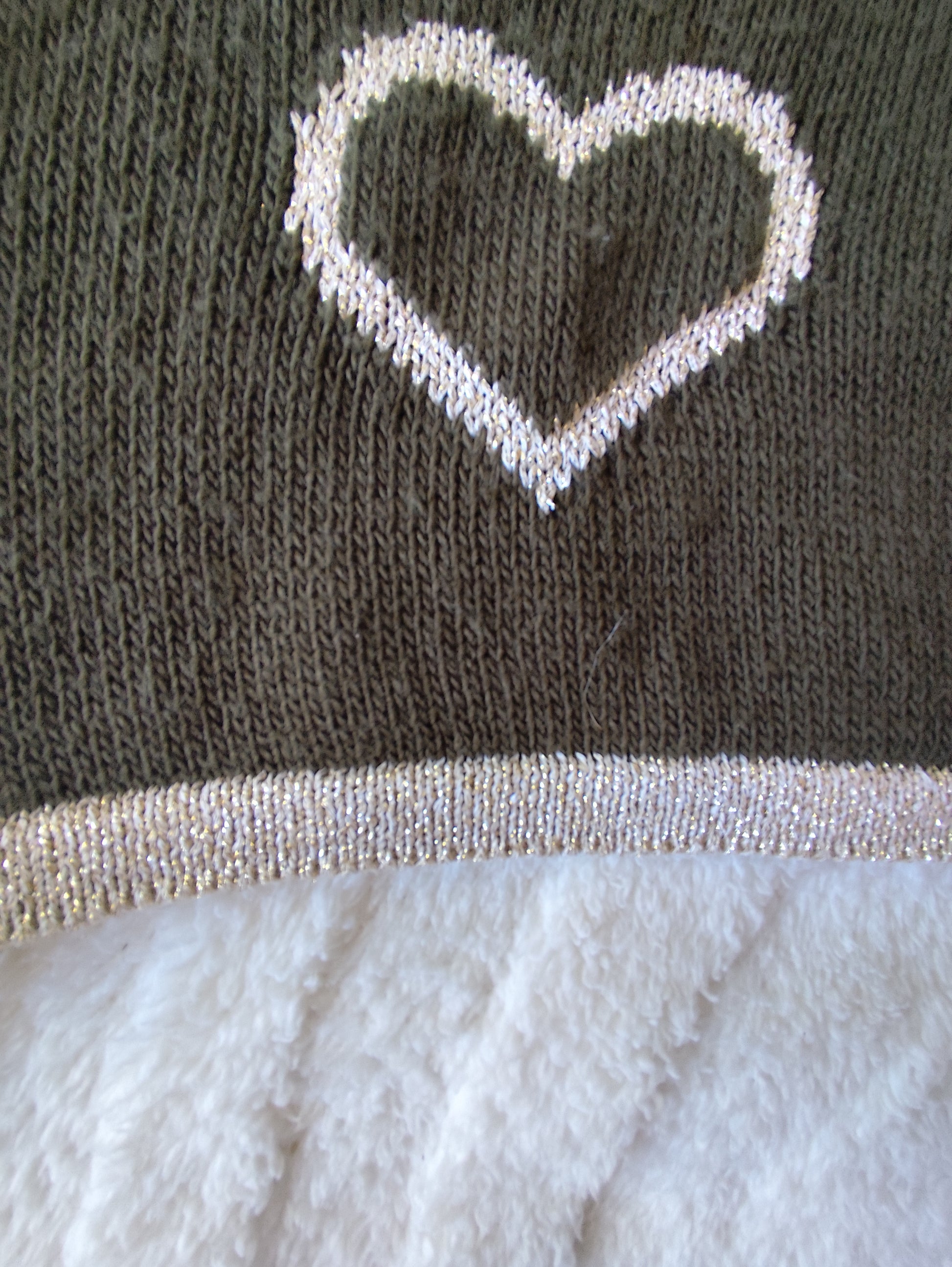 Pull kaki avec motifs cœurs beiges, finition lurex brillant à la base.