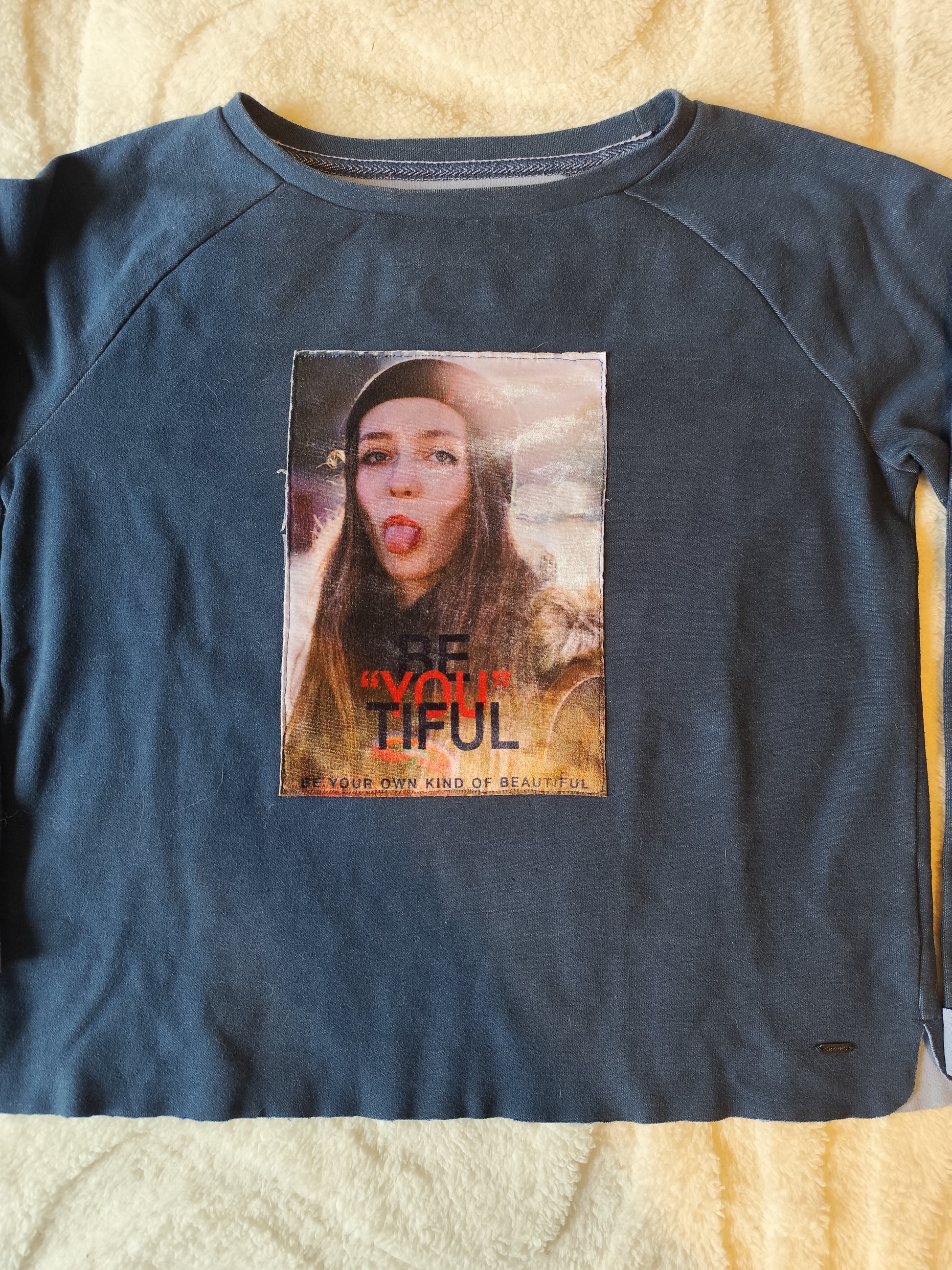 Sweat léger Creeks, coloris bleu, avec imprimé photo + texte “Beautiful” sur le devant.