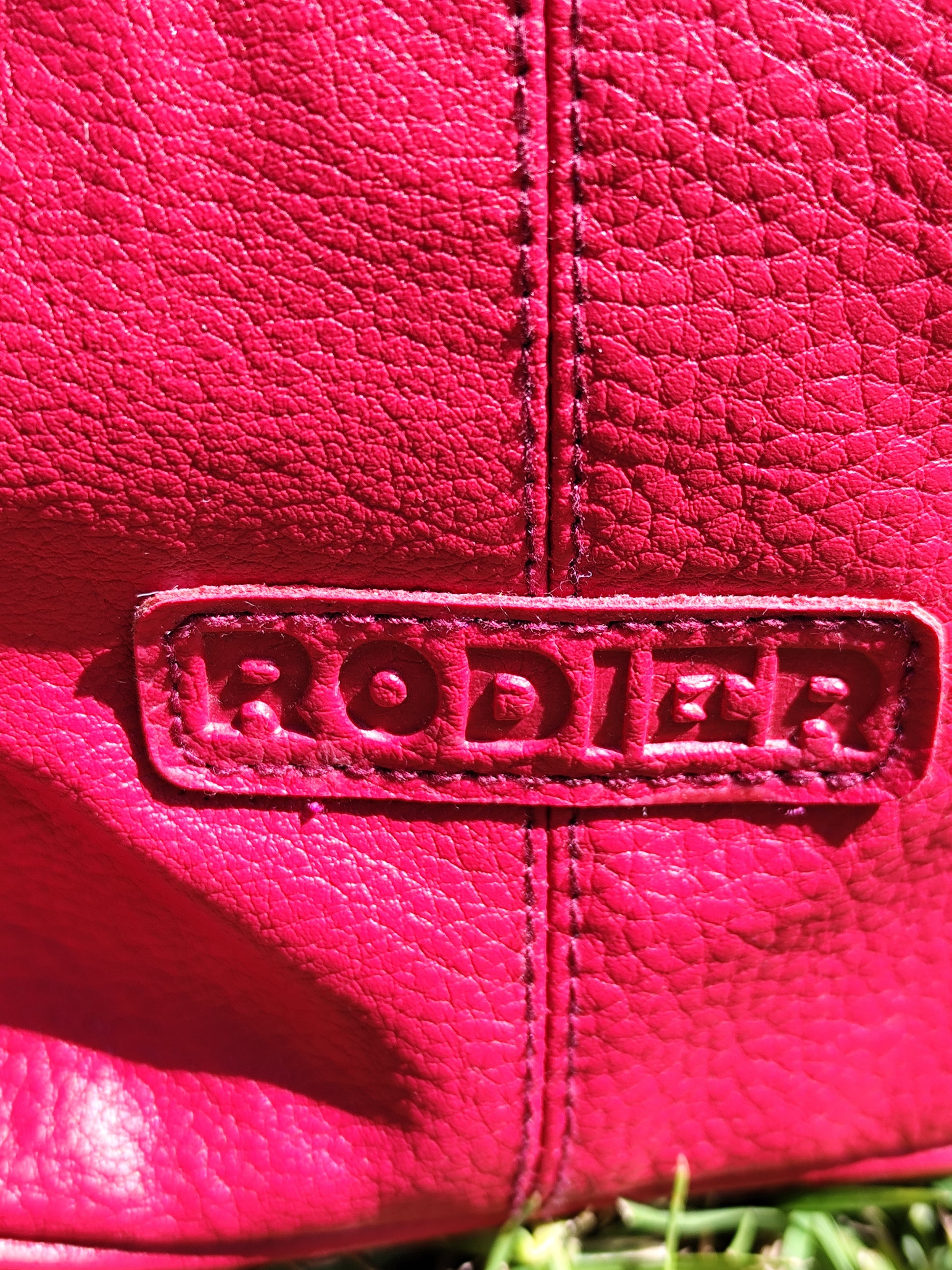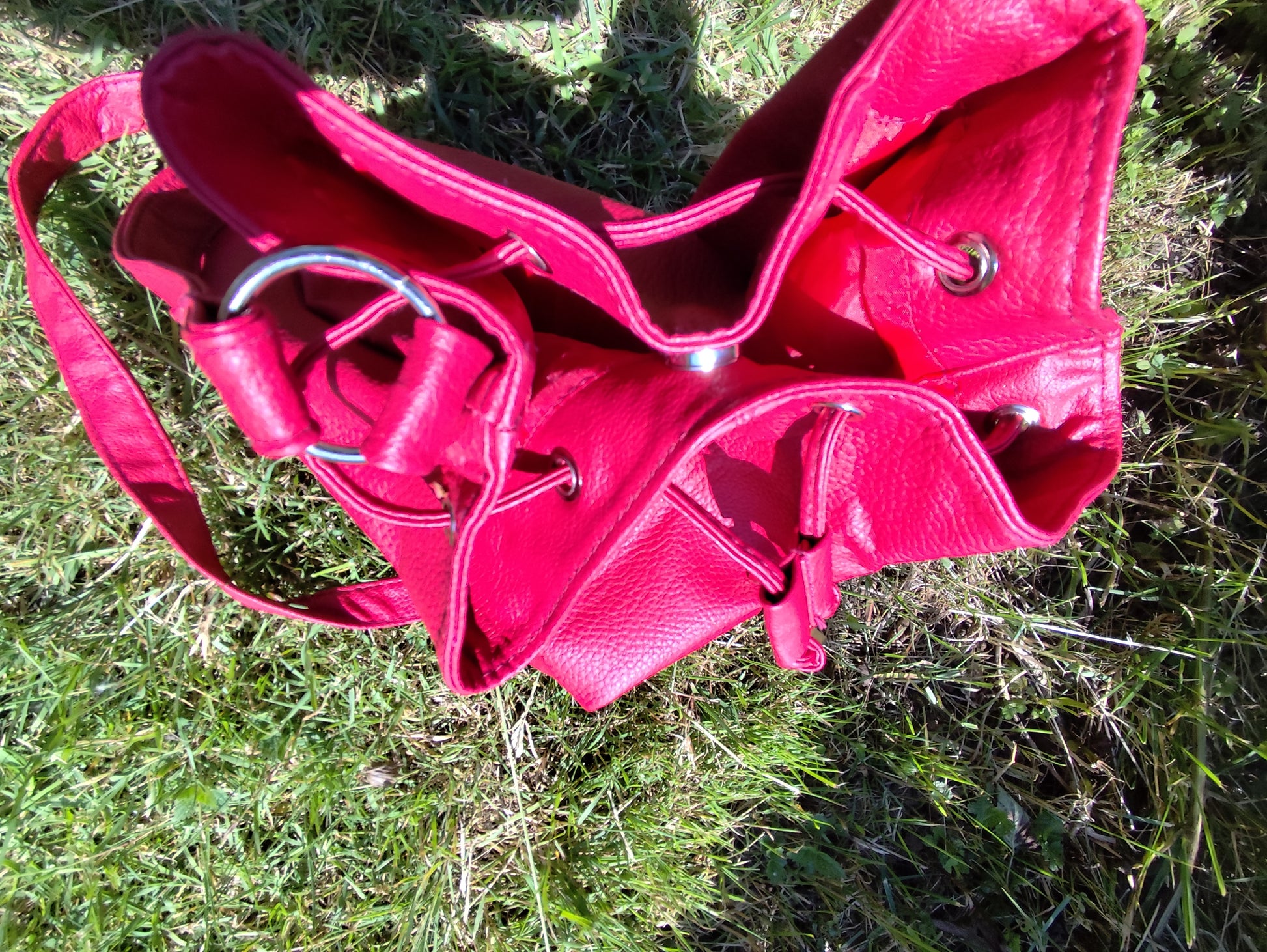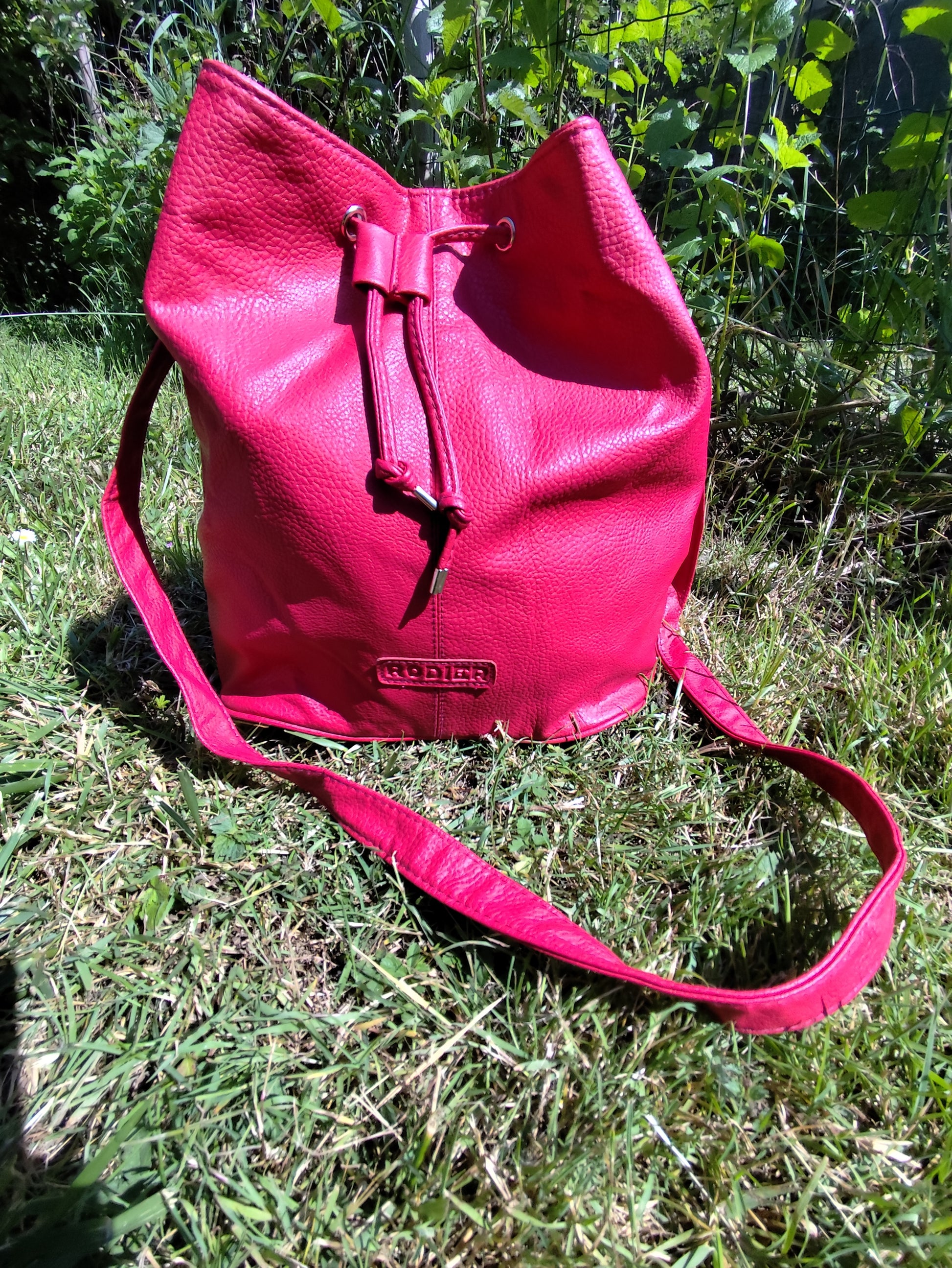 Sac seau souple signé Rodier, en simili cuir grainé rose framboise.