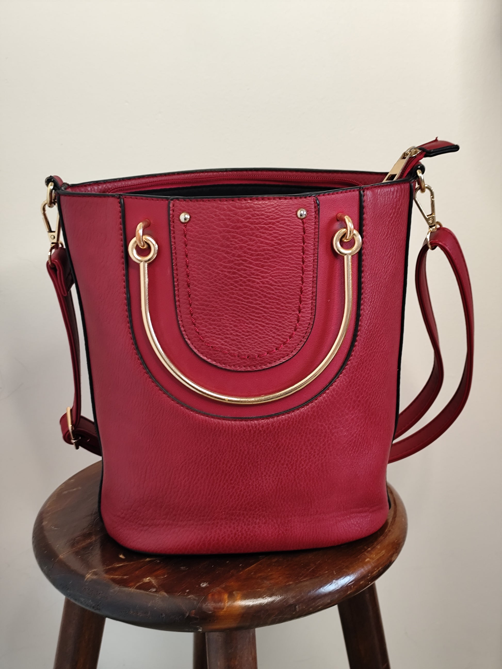 Ce sac à main seau rigide Adopt’ séduit par sa forme structurée, sa couleur rouge profonde et ses anses en métal doré qui lui confèrent un style à la fois chic et affirmé.
