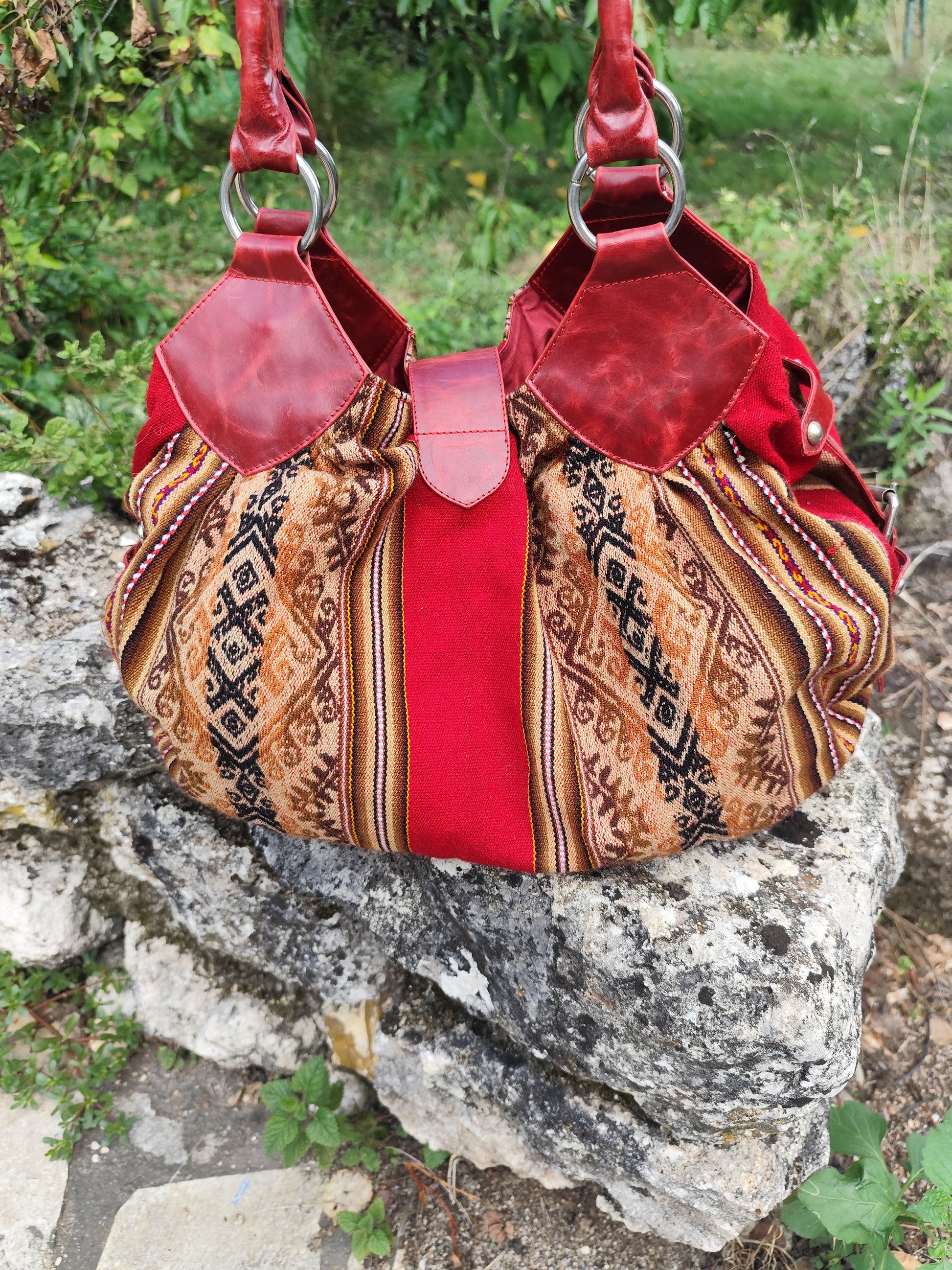 cuir pleine fleur marron & panneaux en tissu  tissé aux motifs rouges et ocres