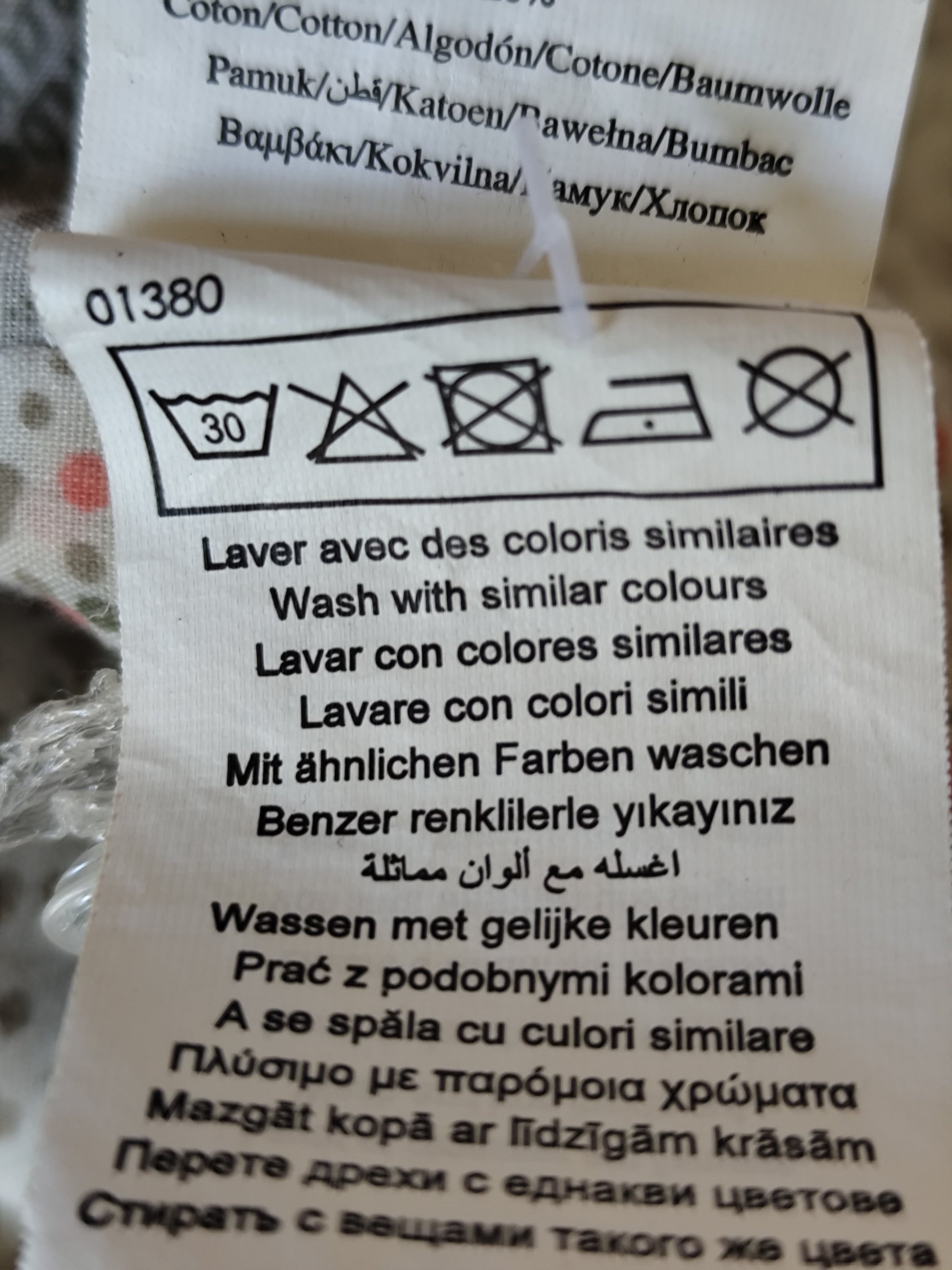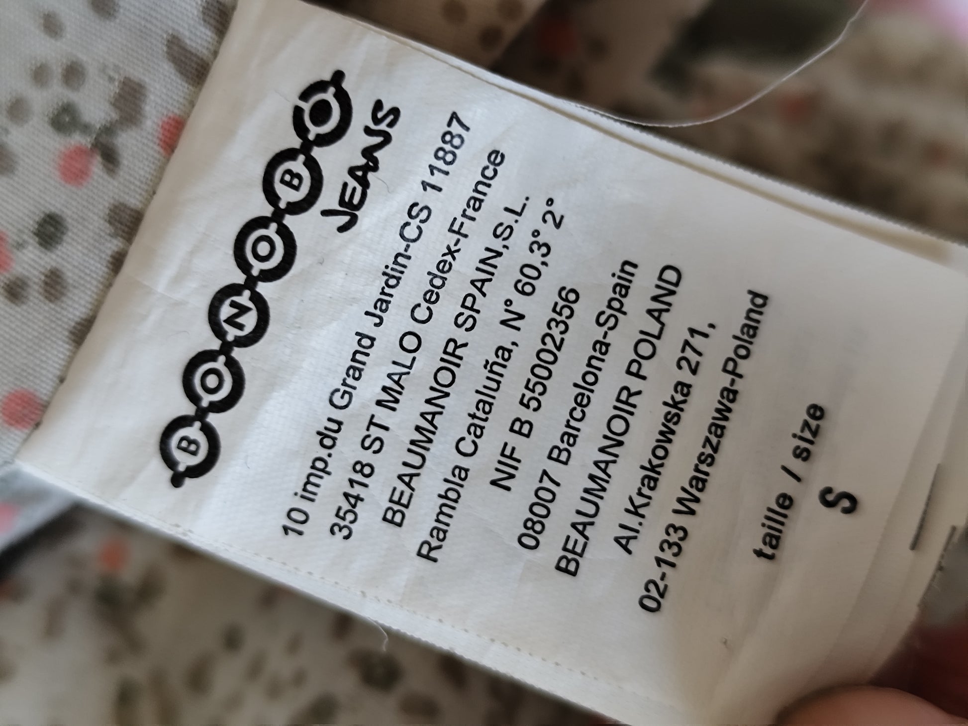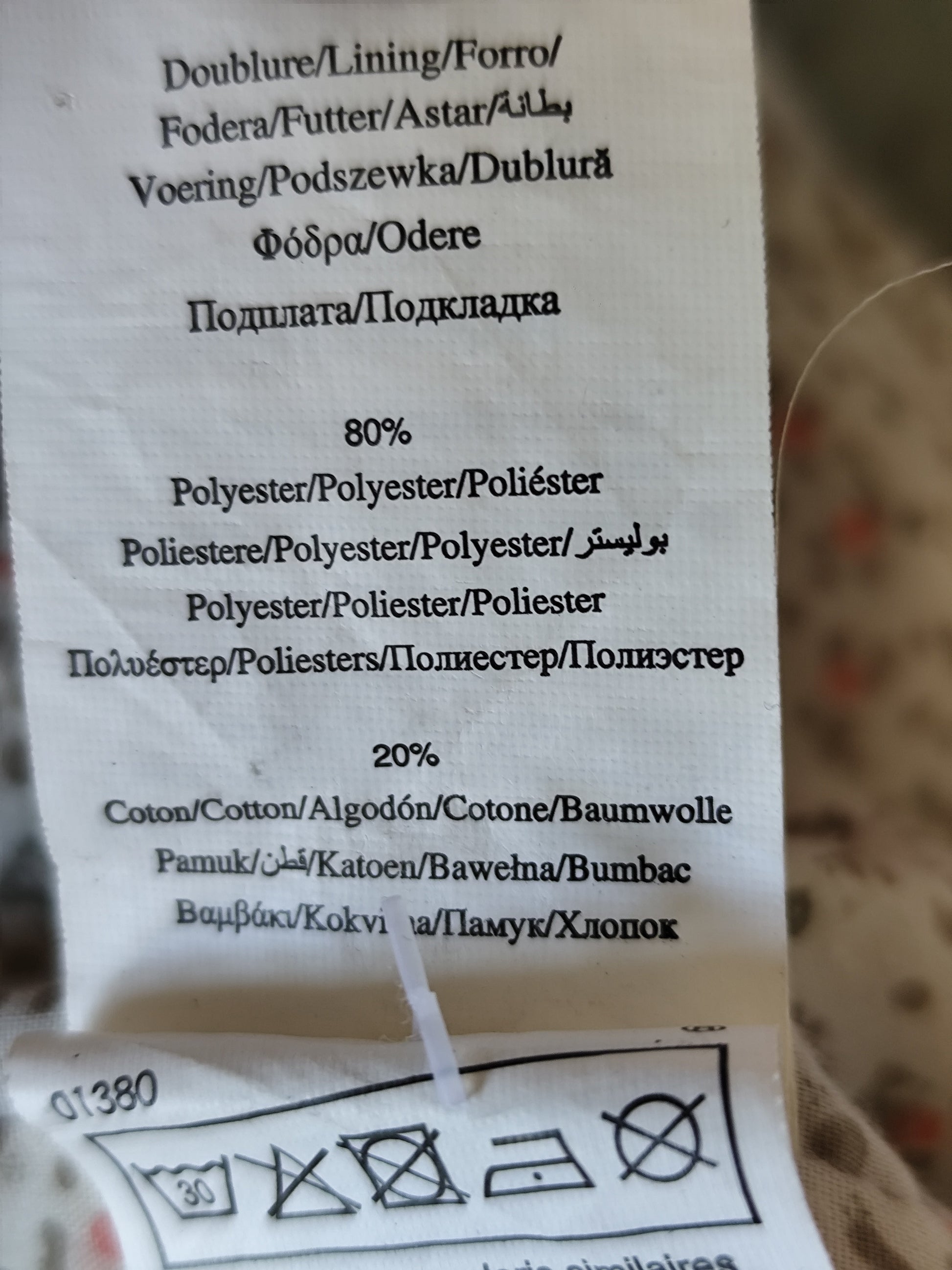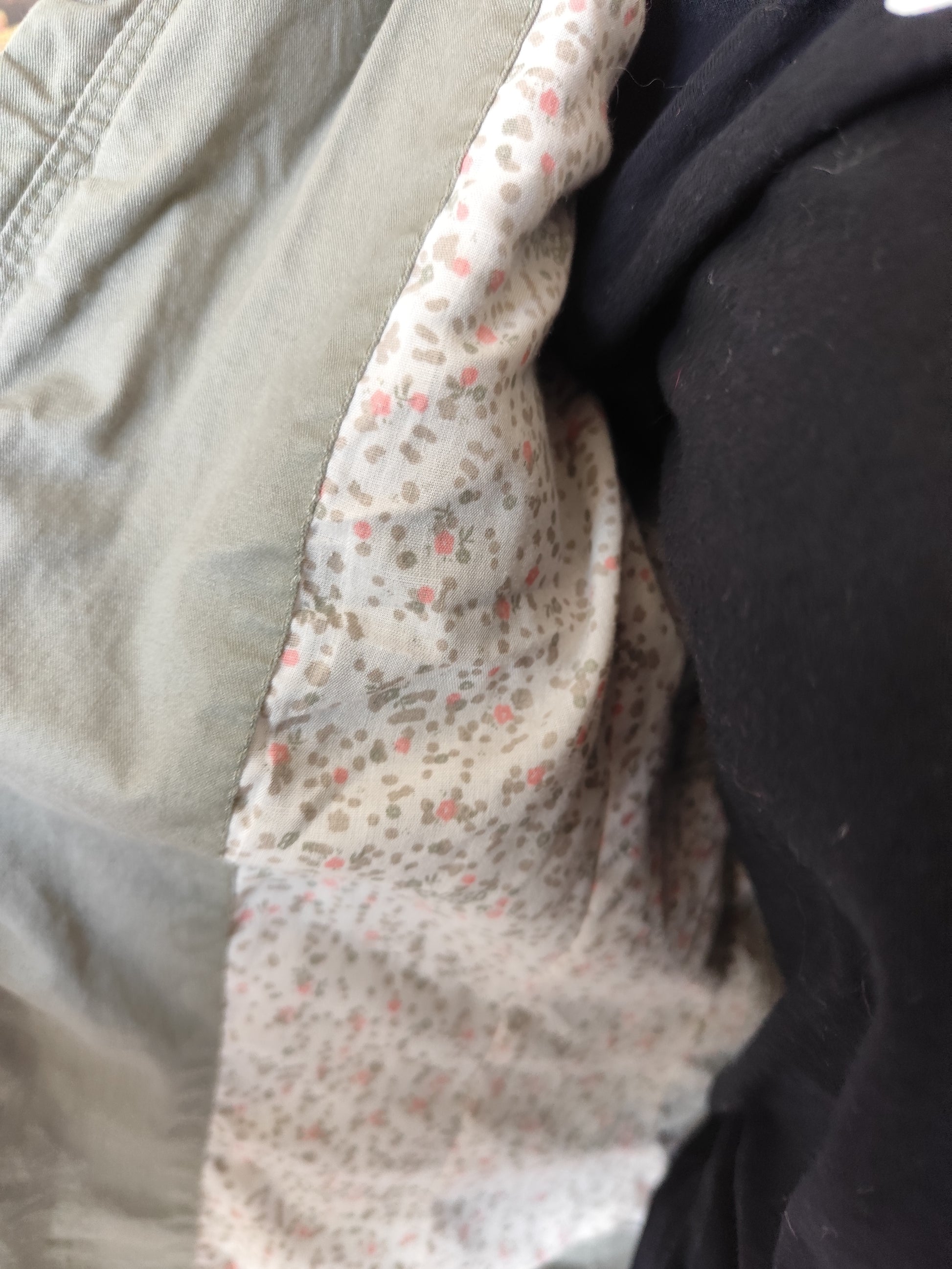 Broderie ton sur ton sur l’épaule gauche, fermeture par boutons décoratifs, gros boutons noirs en relief aux poignets.